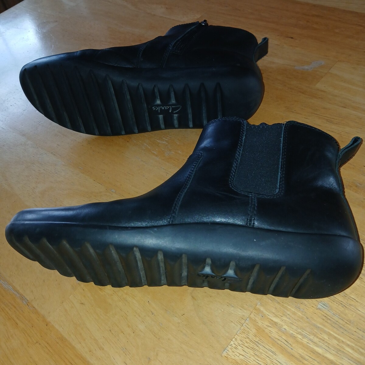 THIS IS A NICE PAIR OF LADIES CLARKS BLACK LEATHER BOOTIES W/SIDE ZIPPER IN A SIZE 11. THEY ARE IN EXCELLENT, GENTLY WORN, CONDITION.