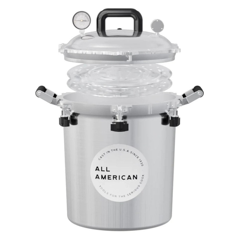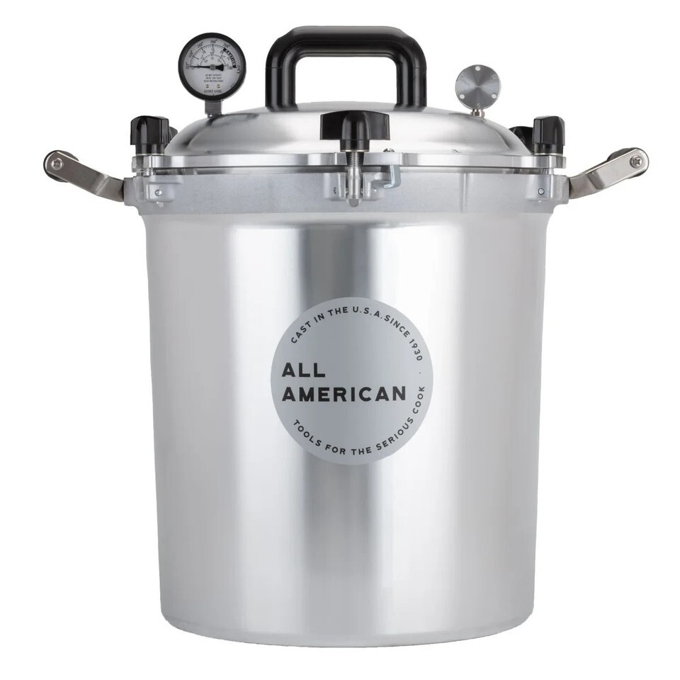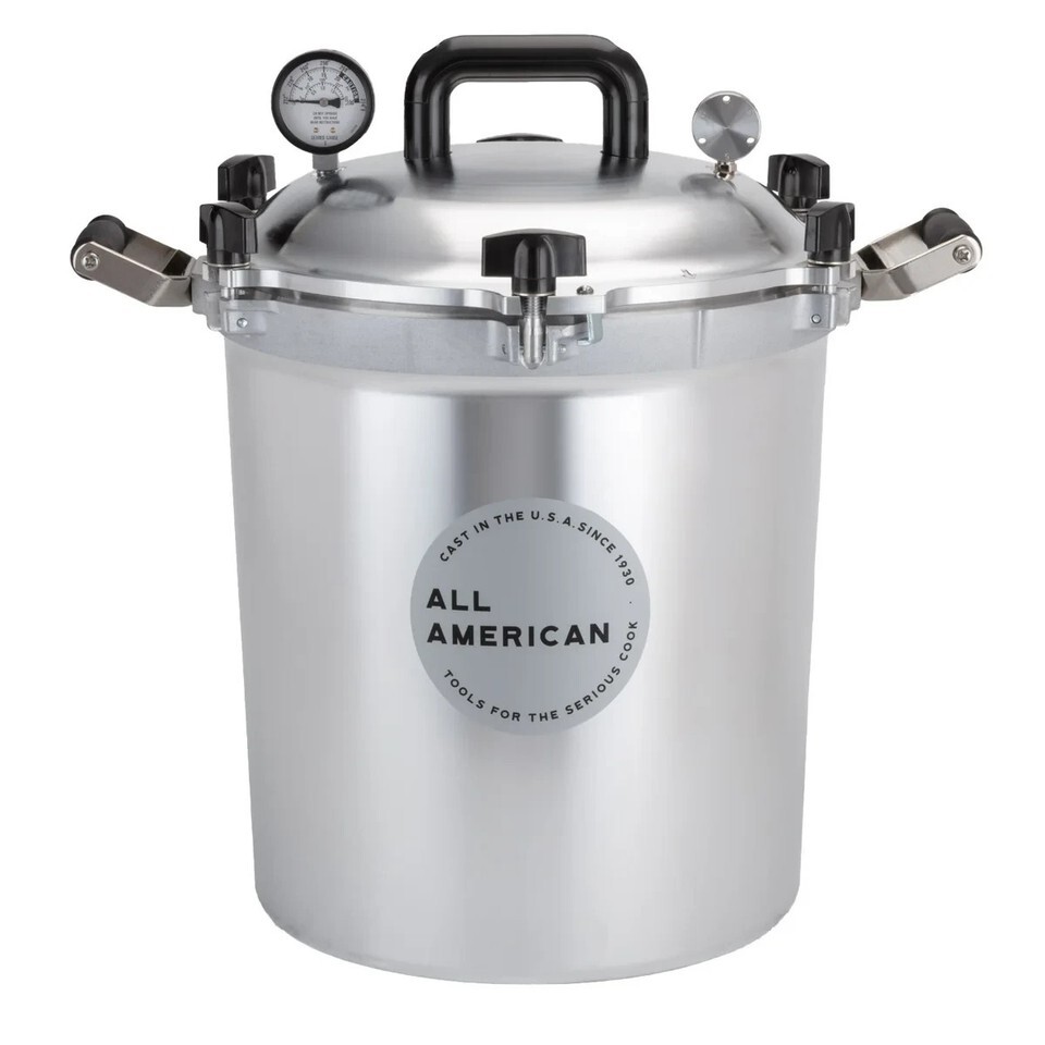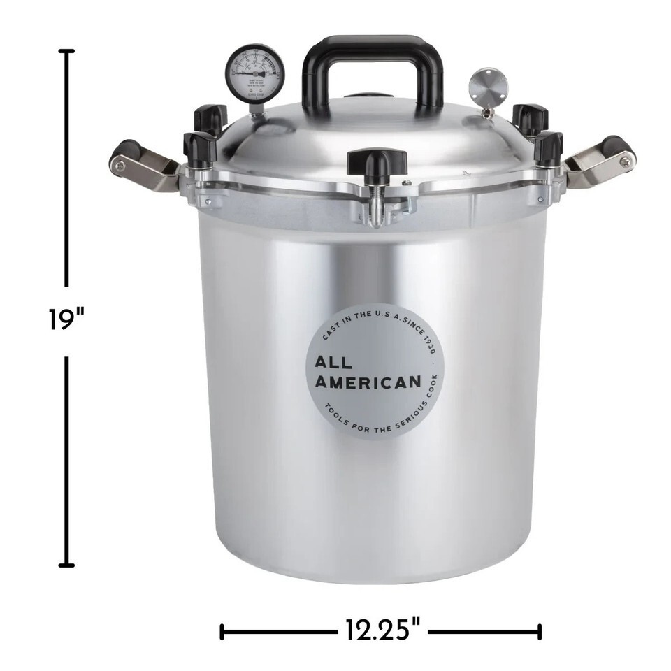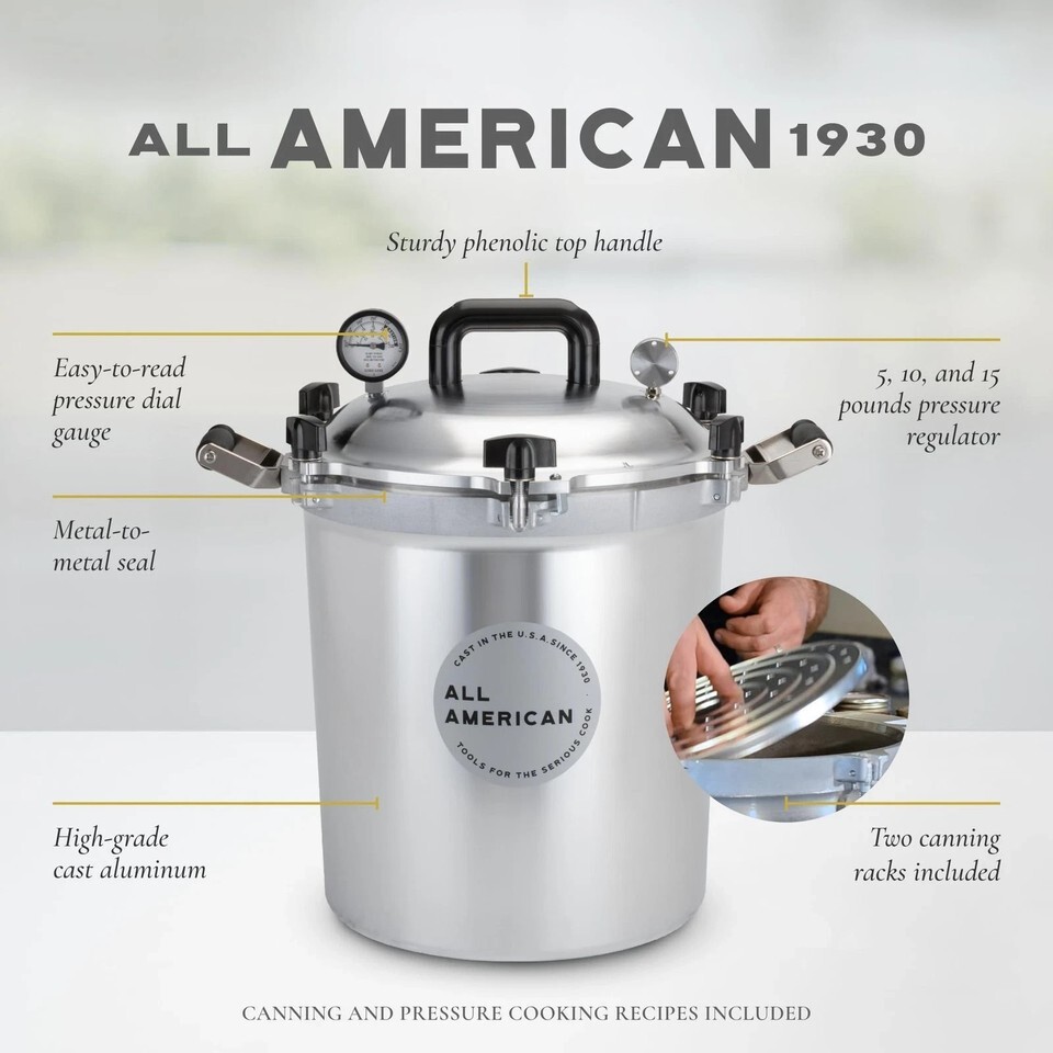 All American 1930 Pressure Cookers/Canners offer an easy solution for home canning. The USDA recommends pressure canning as the only safe way to can meat, vegetables and fruits. Holds approximately 19 pint jars or 14 quart jars.