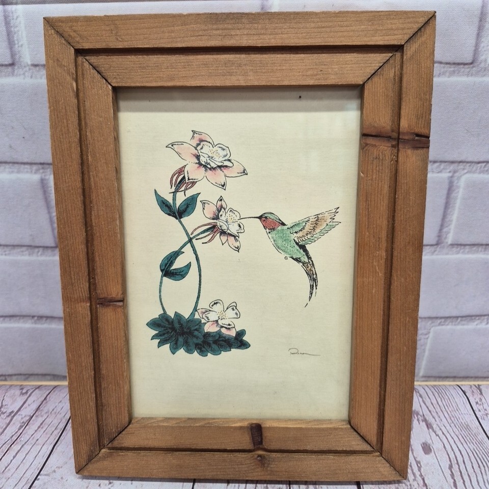Signed Hand Drawing Hummingbird Flowers Framed 8.5inX6.5in