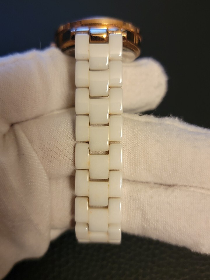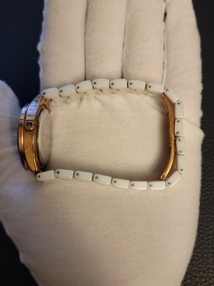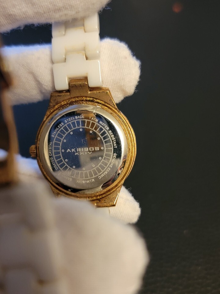 Up for grabs we have a Vintage Akribos XXIV Women's Analog Wristwatch with Ceramic wristband and Sapphire Coated Crystal. Model number AK781WTR. It has a fresh battery and works perfectly! If you have any questions or would like more pictures, just ask!