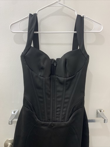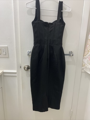 The House of CB London Fiorella Black Satin Corset Midi Dress in women's size XS is a stylish and sophisticated option for any special occasion. Made from luxurious satin fabric, this dress features a sweetheart neckline, midi length, and a flattering bodycon style. The black color and London theme add a touch of elegance, making it a perfect choice for those who appreciate high-end fashion. Perfect for a night out or a formal event, this dress is sure to make a statement and turn heads wherever you go. Preloved in good condition. The threading near end of zipper is a bit loose. See last pic.