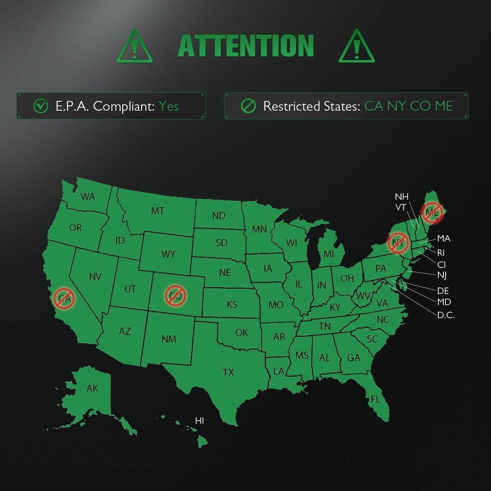 Important emissions notice: not legal for sale or use in California, Colorado, New York, or Maine due to state emissions regulations; intended for use only in federally compliant locations. Please do not order to those locations, we will have to cancel your order.