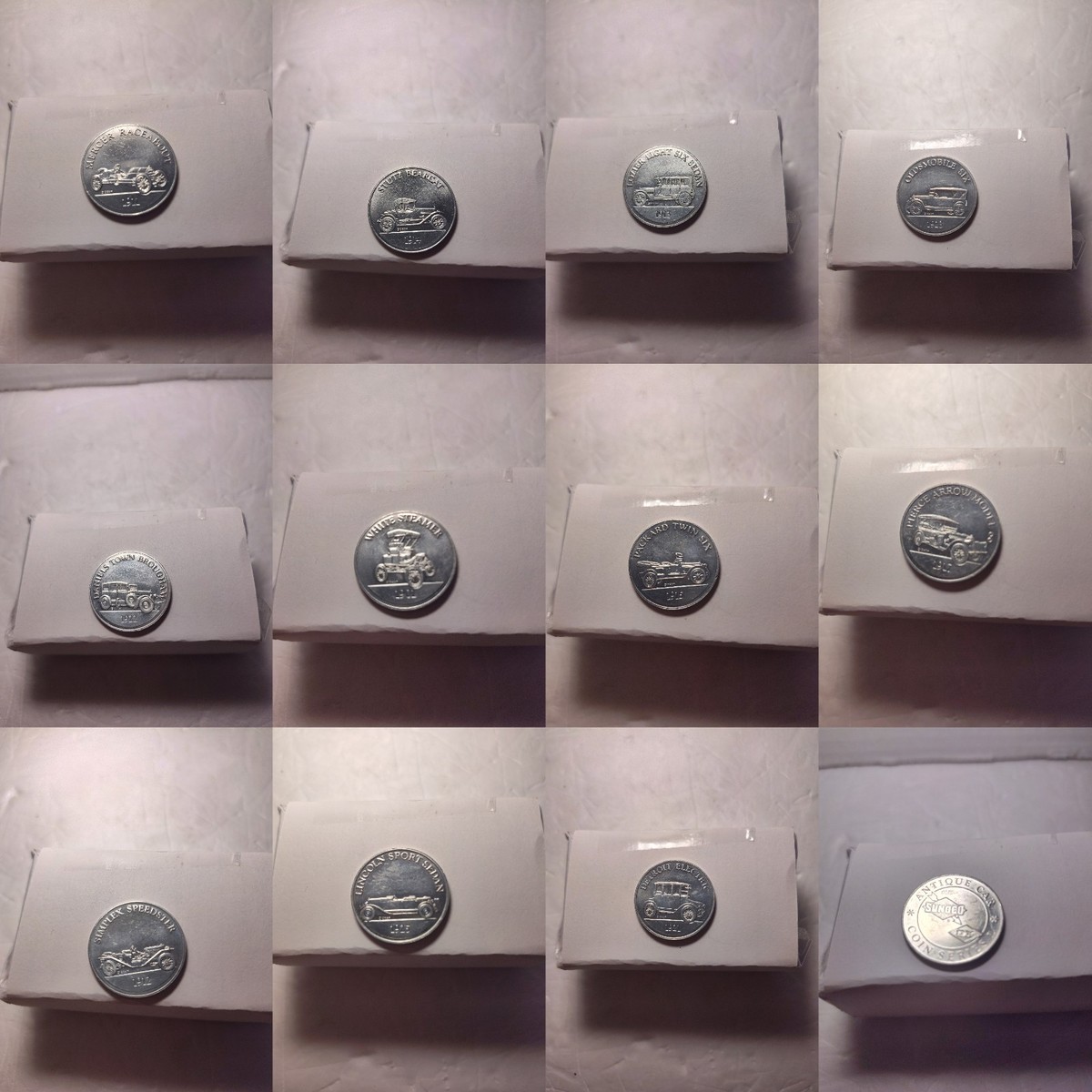 This is a great vintage promotional coin set distributed by the Sun Oil Company (Sunoco) during the late 1960s. These aluminum tokens were given out at Sunoco gas stations as part of their ?Antique Car Coin Series? promotion. Each coin features a detailed engraving of a classic automobile on one side and the Sunoco logo on the reverse.