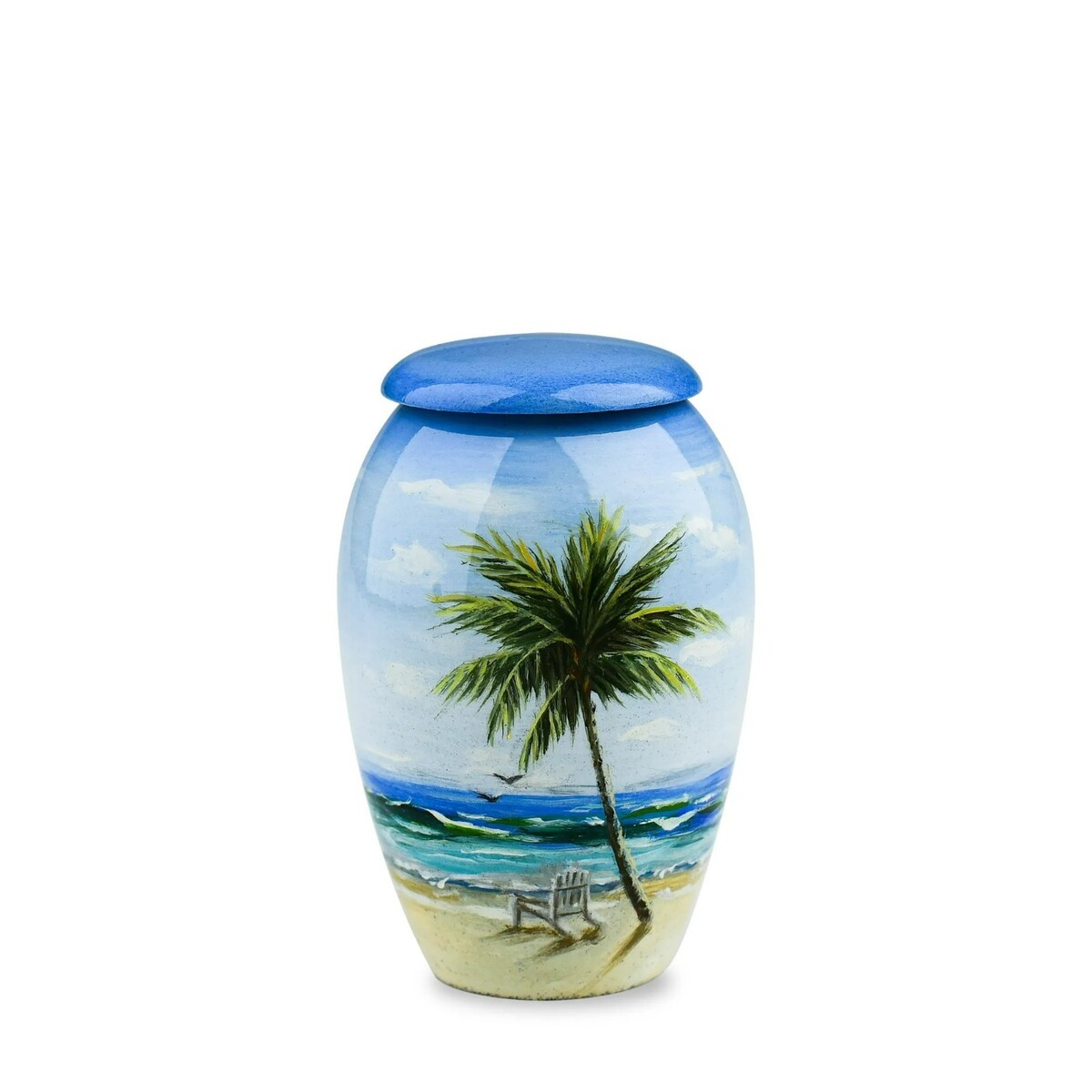 The item you are looking at is our Model Number 009-7820-3, a small/keepsake size aluminum cremation urn, hand-painted collection, depicts a tranquil beach oasis with a towering palm tree shading a lone lounge chair.
