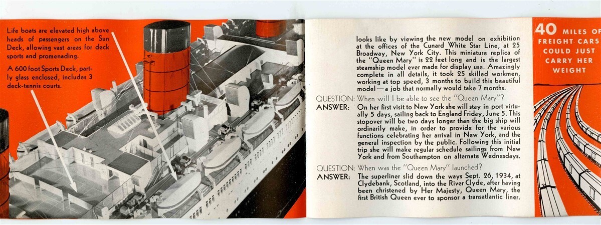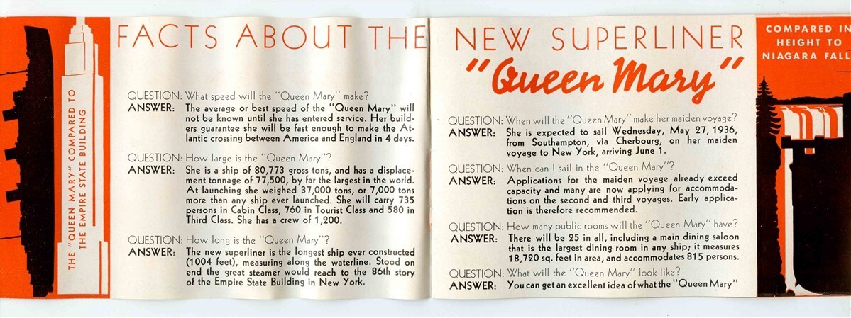 A 12 page illustrated booklet. Questions and Answers About the New Superliner Queen Mary Booklet, published in 1936 by Cunard White Star