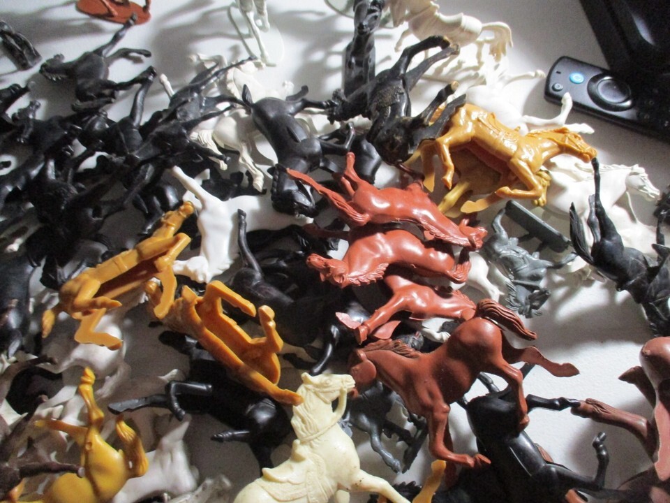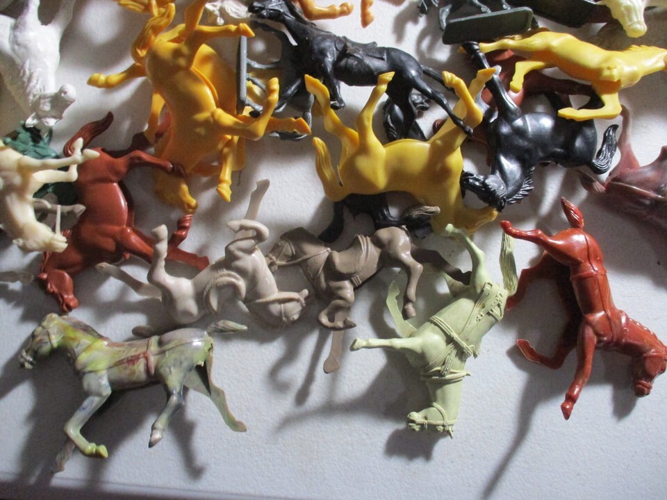 Huge lot of 258 mixed lot of Marx MPC and other assorted vintage Western toys, They all appear to be in good used condition, There are 123 Cowboys and Indians, 105 Horses, and 30 Fence pieces