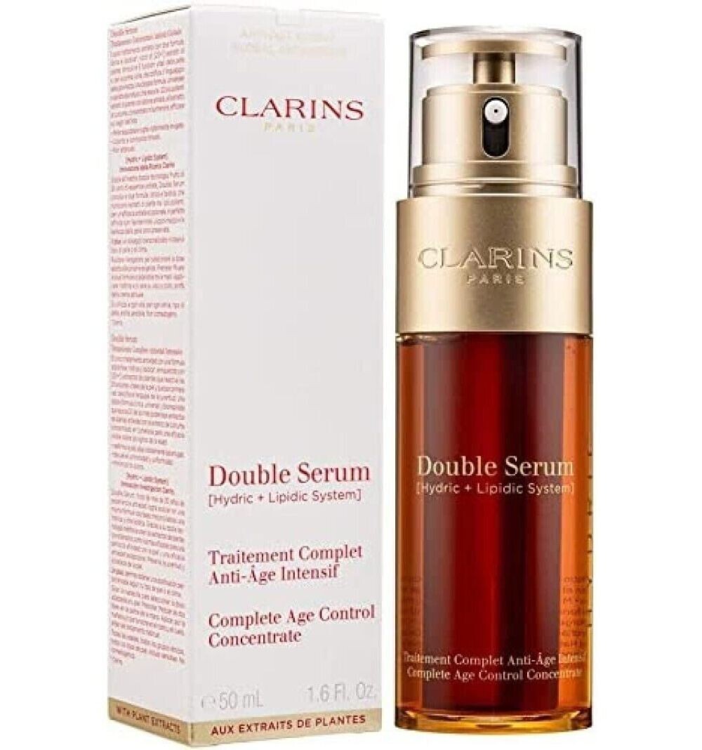 Clarins Double Serum Complete Age Control Concentrate 50m Our most intense age-control concentrate is loved by men and women everywhere. This bestselling serum does it all, drawing on 21 of the most powerful anti-aging plant extracts to tackle fine lines and wrinkles, as well as firm, smooth, refine and brighten your skin.