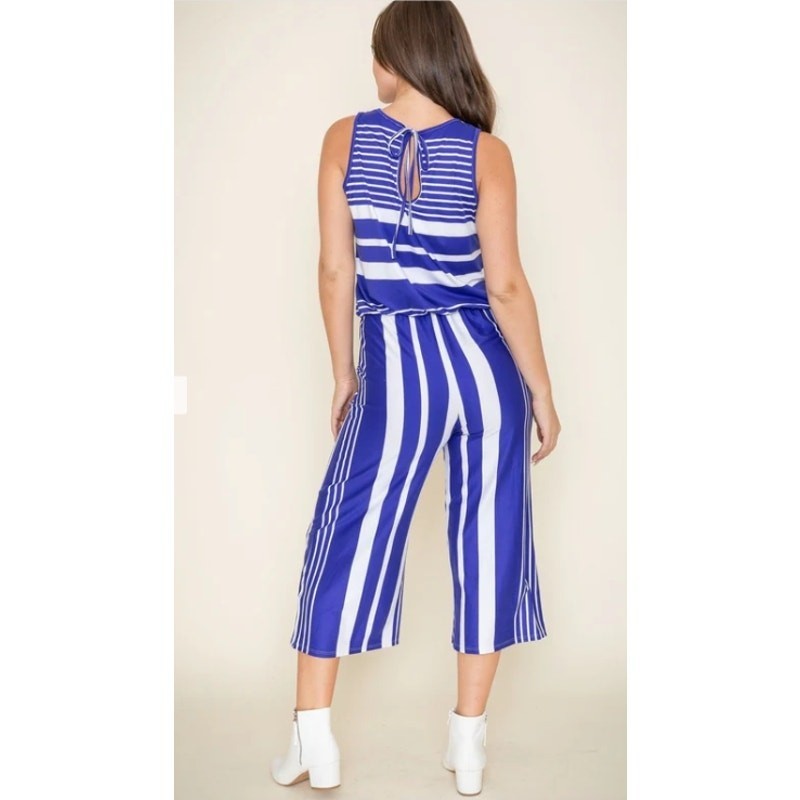Eloges Royal Blue Multi Stripe Sleeveless Cropped Jumpsuit - Small