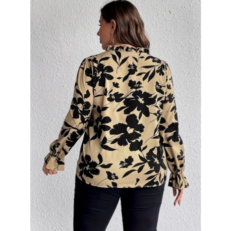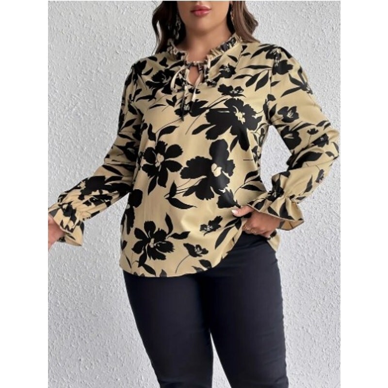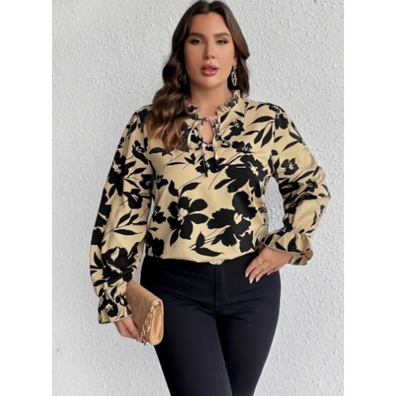 Women's Plus Floral Print Lettuce Trim Lantern Sleeve Keyhole Tie Blouse