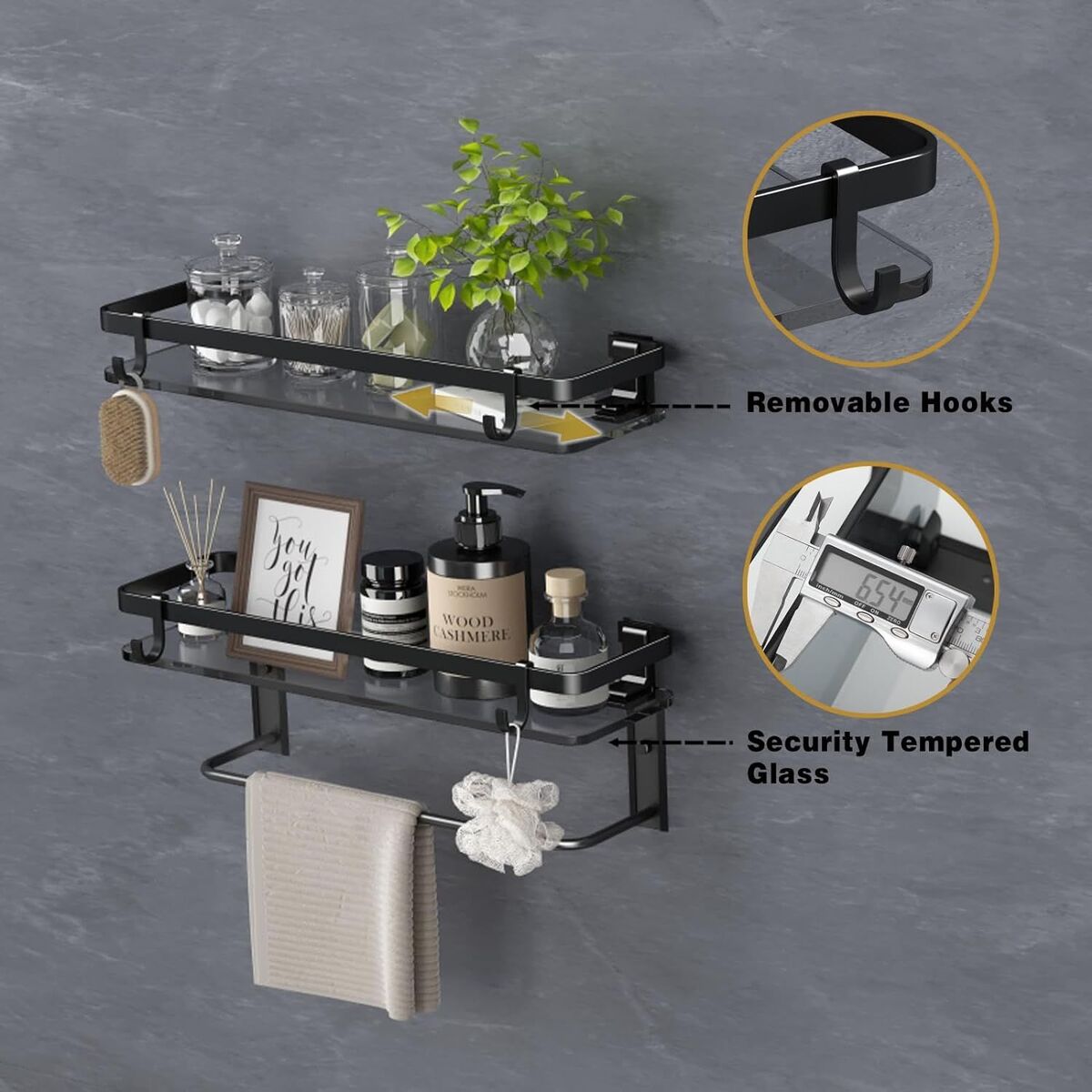 1.Safety Guard: great space saver The bathroom shelves are equipt with a guardrail, which makes it safer to store toiletries. The guardrail is made of high-quality space aluminum, which is anti-corrosion and rust-proof.2.Great Space Saver: There are two wall shelves in total, one of which is equipped with a towel rail. You can install it in the bathroom to store toiletries and cosmetics. Can also be installed in the kitchen seasoning and hand towels.[Upgraded Rustproof Frame] Others? glass wall shelf has only 1 screw on each side that attaches the shelf to the wall, causes the top of the bracket to pull away from the wall. We upgraded with 2 screws on each side and keep its looking. Not only strong, but also rustproof.[Innovative Tempered Glass] We upgraded the glass . Replaced the regular clear glass with a tempered glass, which is stronger, resistant to high temperatures, not easy to damage and convenient in cleaning.[Easy to Install]the bathroom shelf can be installed by an adhesive method or drilling method. Adhesive Install: no drill no damage to tile wall. Drill Install: suit for drywall. All tools and instructions will be included.[Great Space Saver]We extended the length of the bathroom wall shelf from 13.78 to 15.74 inch and 1 towel bar. Which is expanded storage space and convenient to towels.[What You Get]1 glass shelf with towel bar, Overall dimensions: 15.74 x4.88 x 5.85 inches (LxWxH).1 glass floating shelf, Overall dimensions: 15.74 x4.88 x2.85 inches (LxWxH).all the mounting hardware, and glues for adhesive mounting, 1instruction for installation. If there is something unclear during the installation, please check the installation video in the listing, or you can contact us to send you the video.Note: Hook not included