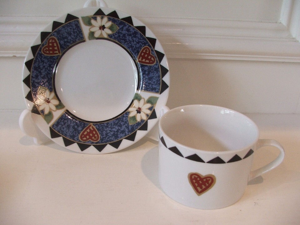 Whether you are adding to your set or wanting something new, these cup saucer sets will look great in your country home. They are used but still have a lot of life left in them. No cracks, chips, or crazing but do show some utensil scratchings from normal use. The saucers are 6 1/4" diameter and the Cup is 2 3/8" high by 3 1/4" diameter. They are dishwasher, oven, and microwave safe.