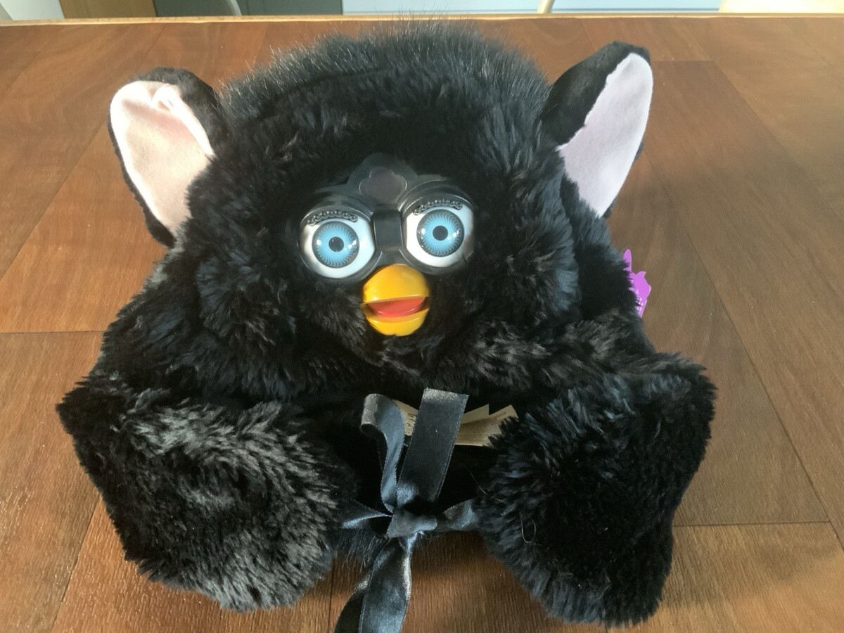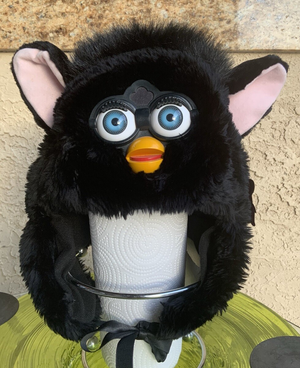 This FURBY hat features a unique fluffy black design with pink ears and black satin ribbon ties for attaching under the chin.