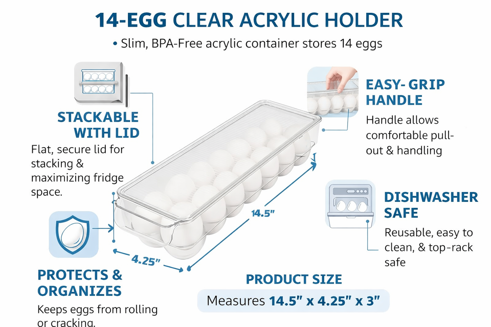 Clear Acrylic Egg Holder with Lid 14-Egg Tray BPA-Free Stackable Organizer