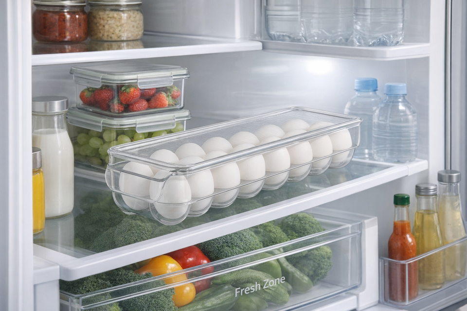 Keep your refrigerator organized with this clear acrylic 14-egg storage container. The slim rectangular tray holds fourteen eggs securely and helps prevent rolling or cracking. Made from durable, BPA-free acrylic, the clear design provides full visibility so you can easily check egg quantity at a glance.