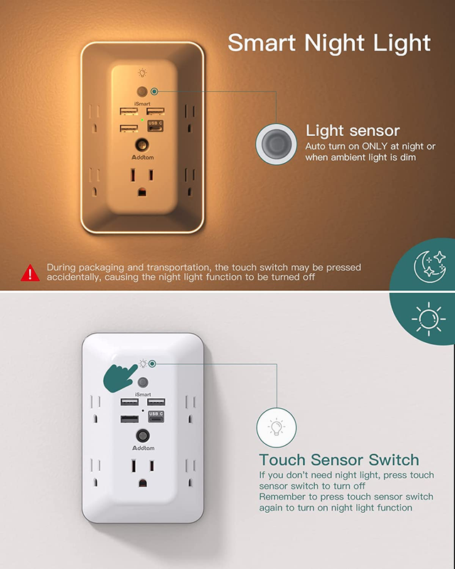 ?9 IN 1 USB Wall Outlet?You get 4 USB charging ports (1 USB C) and 5 wide-spaced outlets; 3 side design plug extender provides large space; LED night light around the edge of the outlet extender makes life more convenient; removable screw and the plastic prong make it firmly attached to the outlets