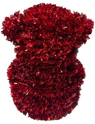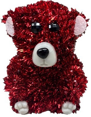 The 4"x4" Red Tinsel Teddy Bear is a small figurine perfect for a Valentine's Day gift. Made of tinsel and plastic, this bear stands at 4 inches tall and is decorated in a festive red color. It is a cute and whimsical addition to any room, with an art deco style that adds a touch of charm to your home decor. This bear is a free-standing figurine that does not require any additional parts for display, making it easy to place in a cozy corner or on a tabletop. It is a unique and adorable gift that will bring joy to any teddy bear lover.