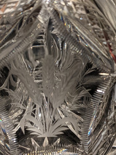 Up for sale is a Rare ABP Libbey Brilliant Cut Glass Pinch Whiskey Decanter Whiskey with etched Corn and Wheat and Stopper. The stopper has a chip. See last picture.