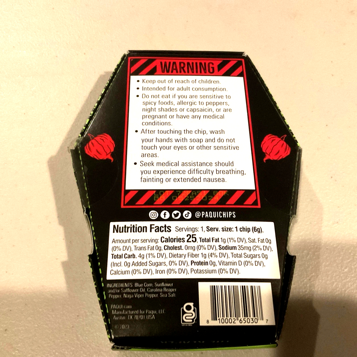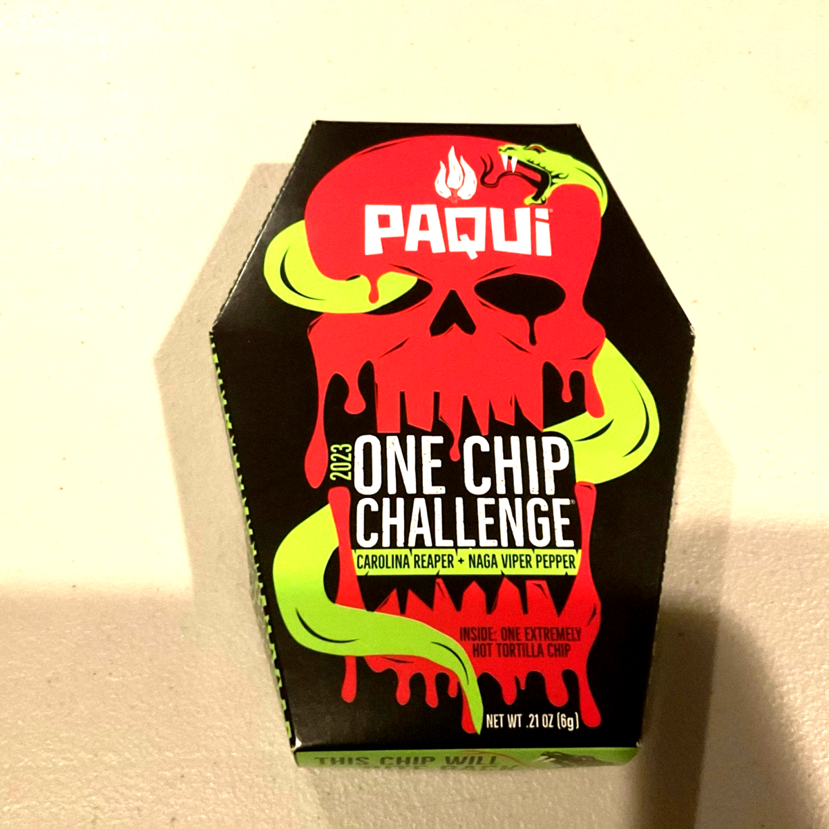 The 2023 One Chip Carolina Reaper + Naga Viper Pepper is a discontinued novelty package of chips produced by the brand Paqui. This spicy chip features the intense flavors of the Carolina Reaper and Naga Viper peppers, making it a sought-after snack for those who enjoy a kick of heat in their food. Perfect for those who enjoy adding a unique and spicy twist to their pantry collection, this product offers a limited edition experience that is sure to excite any chip enthusiast.