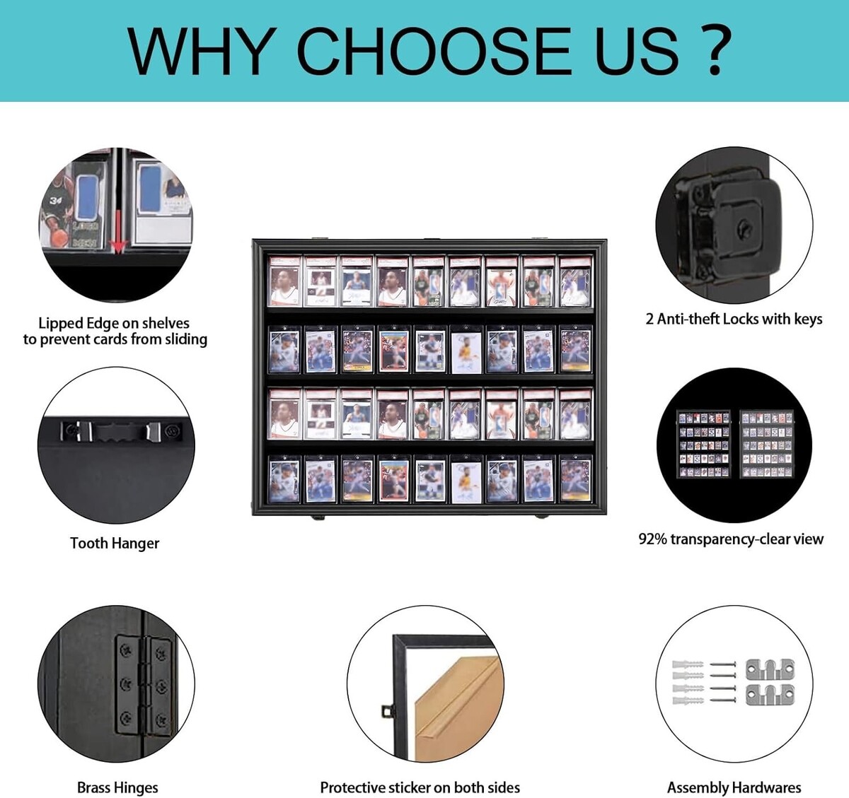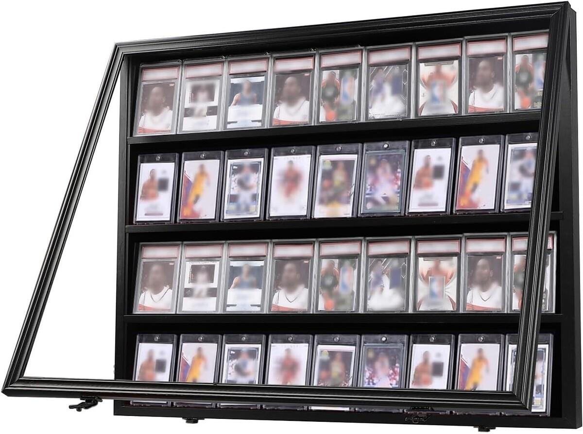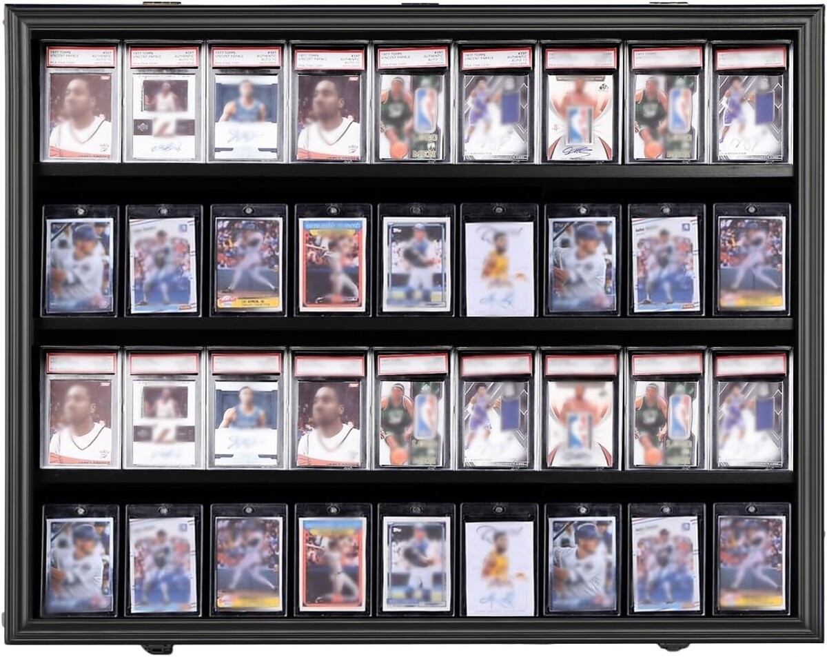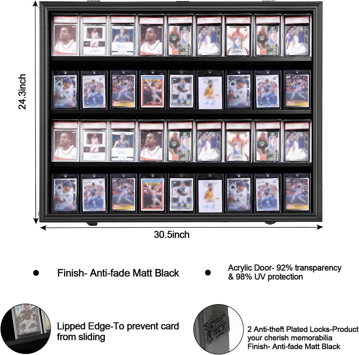 36 Graded Sports Card Display Frame - Baseball, Basketball, Football, Hockey Card Display Case - Lockable, 98% UV Protection Acrylic, Black