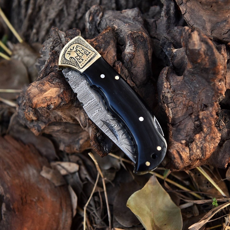 This handmade pocket knife is forged with Damascus steel and has a clip point blade edge that is perfect for outdoor activities. The knife is ambidextrous and comes with a black Bull Horn handle. The lockback mechanism ensures safety and the knife is easy to open manually.