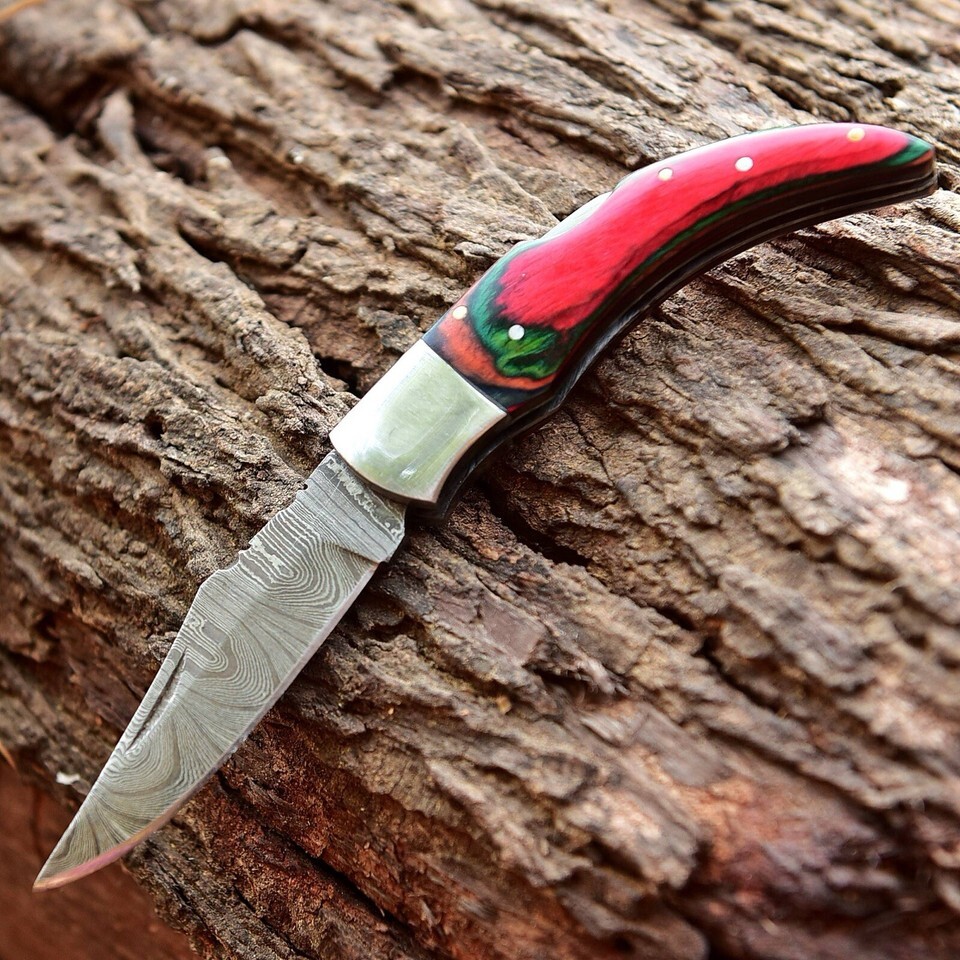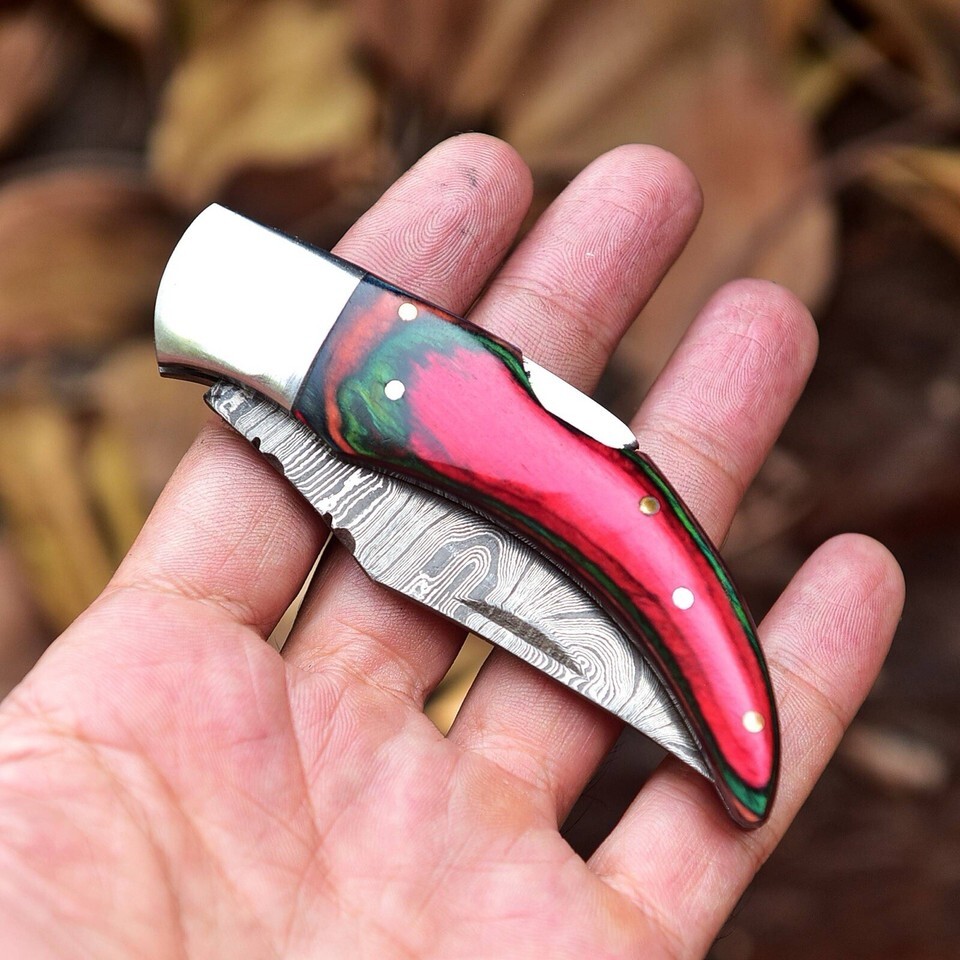 Custom Handmade Damascus Steel Foldable Blade Pocket Knife Pakkawood Handle