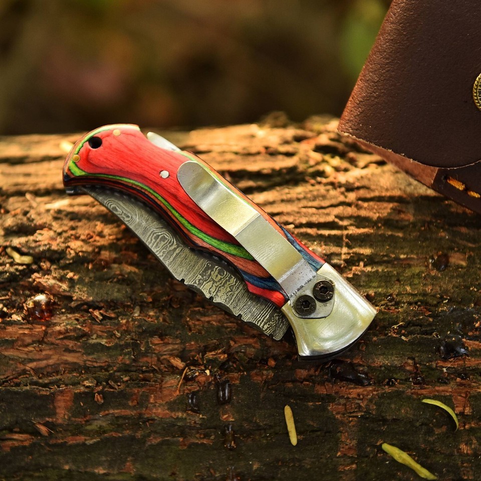Handmade Damascus Folding Blade Pocket Tactical Knife with Belt clip & Sheath