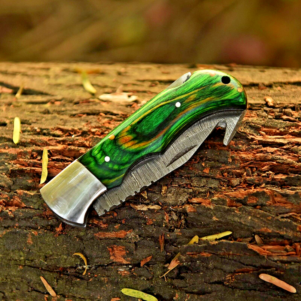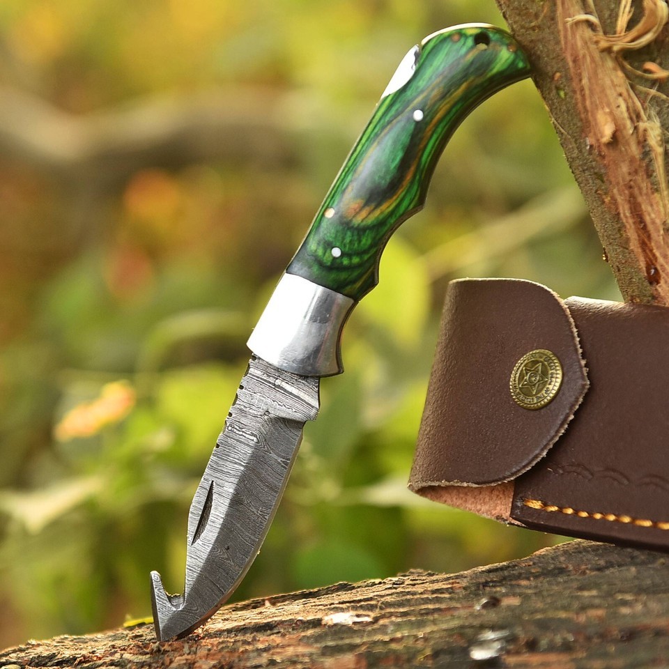 Custom Handmade Damascus Folding Blade Pocket knife - GutHook Skinning Blade EDC
