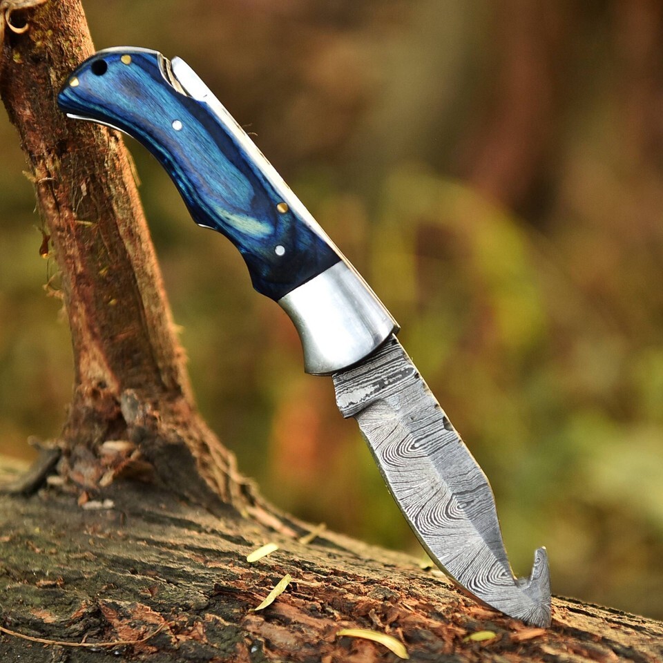 Damascus Folding Gut-Hook Blade Pocket Knife Skinning Tactical Hunting EDC