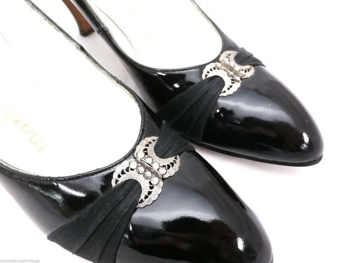Womens vintage 1950s shoes, from Martinique, Franklin Simon. These were never worn! The patent leather is as shiny as the day they were born, and they have pretty satin pleated ribbons with silver filigree and rhinestone accents on the upper. They have leather soles, and you can tell these were expensive when new.
