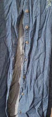 This dress is in good used condition. There are no holes or stains that I found. All of the buttons are intact. The size tag is missing so size is unknown. As seen in the photos, there is writing on the dress at the tag. Measurements are approximately: Length: 41 inches. Pit to Pit: 26 inches.