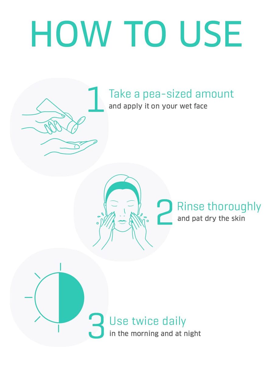 Apply on wet face. Gently massage in circular motion with fingertips avoiding the eye-contour. Rinse thoroughly and pat dry.
