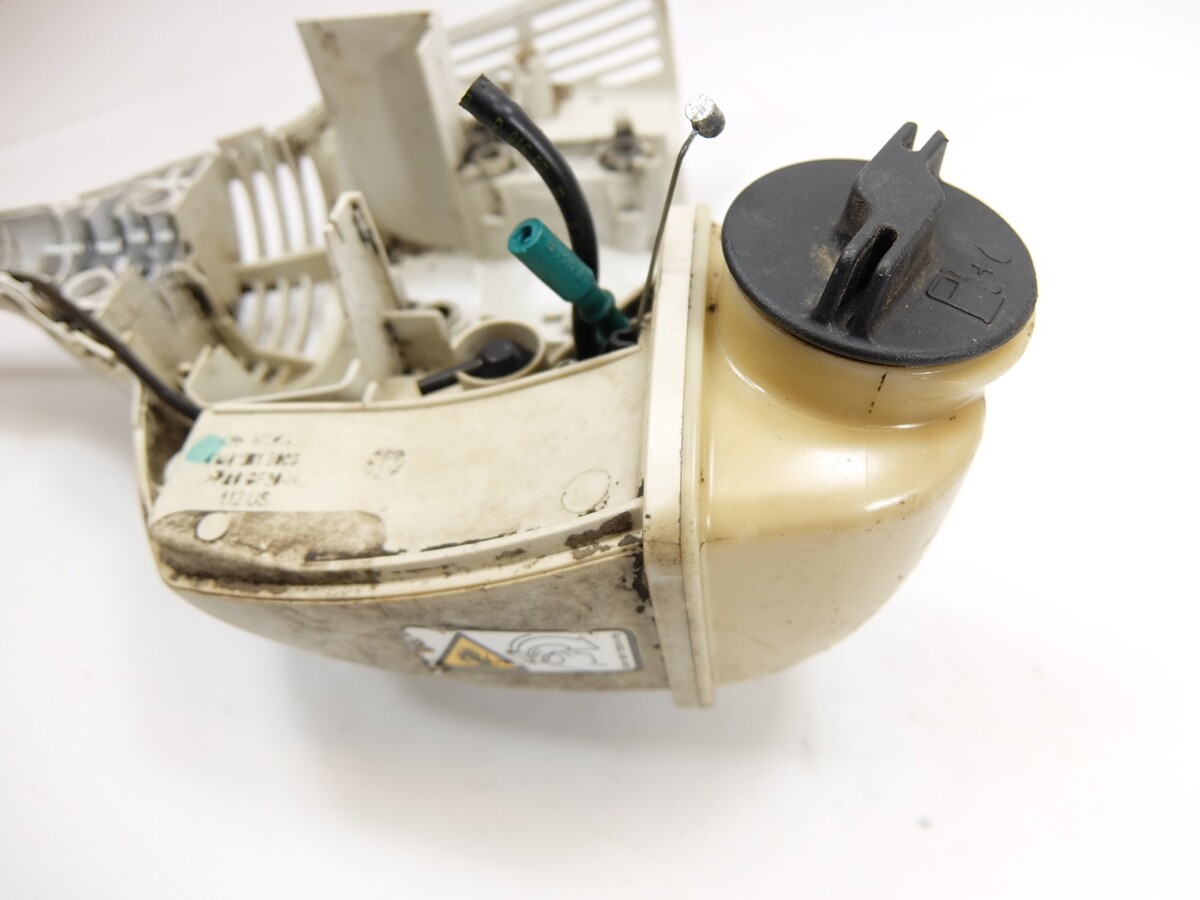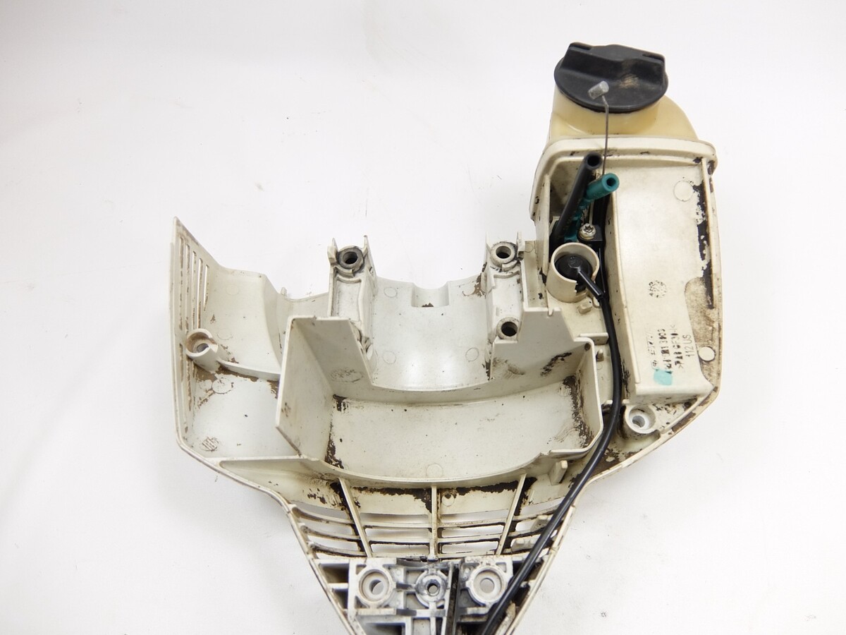 This is a used OEM lower engine cover and gas tank from a STIHL FS56RC-E trimmer. This offer includes the fuel cap, trigger, and throttle cable.
