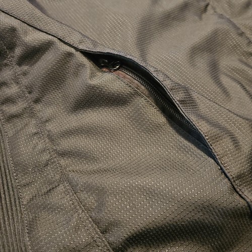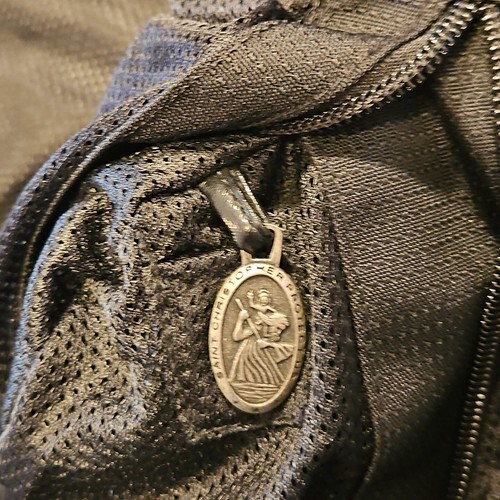 Inside zip pocket with a Saint Christopher medallion and pouch for it