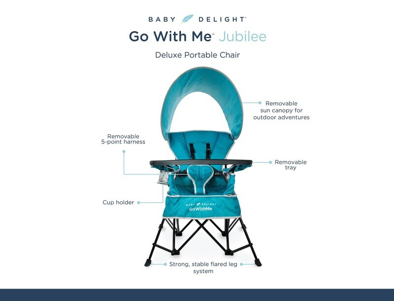 Baby Delight Go With Me Jubilee Deluxe Portable Chair, Removable Canopy, Teal Seats from baby (approx. 3 mos.) to 75 lb. child (Unisex) The 5-point removable harness keeps your child secure and comfortable Removable snack tray and sun canopy 8 strong, stable flared leg system Indoor/outdoor polyester fabric Travel storage bag included Dimensions: 24.5? tall x 23? wide x 22.75? deep Product Weight: 4.9 lbs