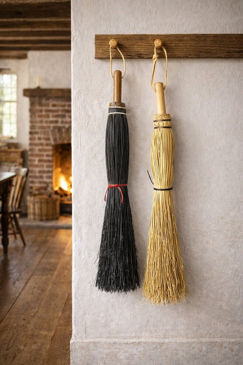 Each broom features a solid hardwood handle with a rawhide hanging loop, making storage easy and adding rustic appeal to any hearth, porch, or mudroom.