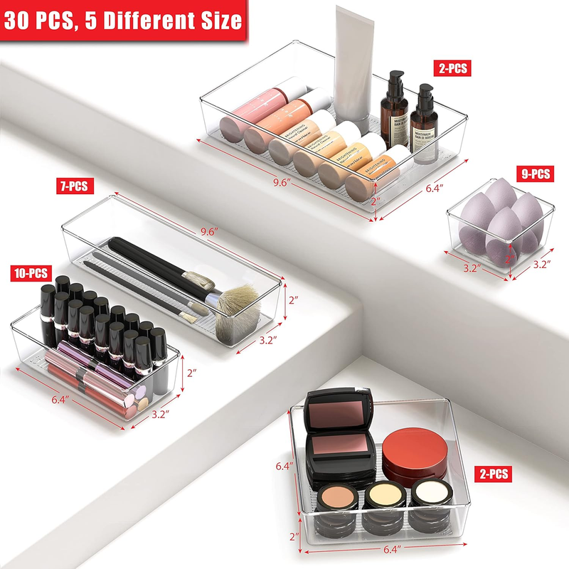 30 PCS Clear Plastic Drawer Organizers Set, 5-Size for Makeup, Bathroom, Bedroom