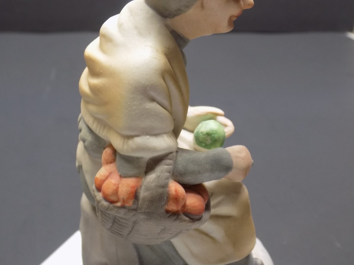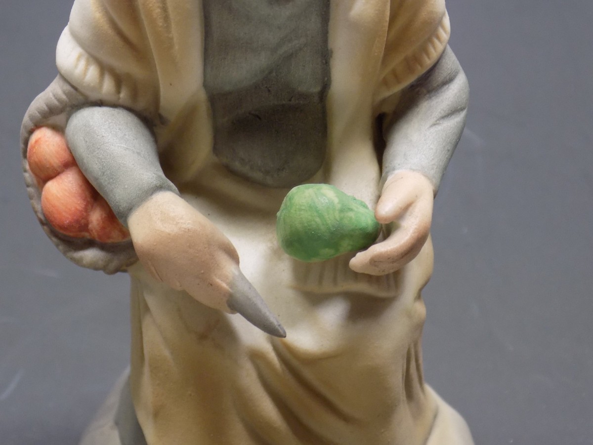 This vintage porcelain figurine depicts an elderly woman seated on a rock?style base while holding fresh produce, including a green vegetable in one hand and a basket of carrots or apples resting on her arm. The sculpting features detailed folds in the clothing, textured baskets, and expressive facial features, giving the piece a warm, rustic, old?world charm.