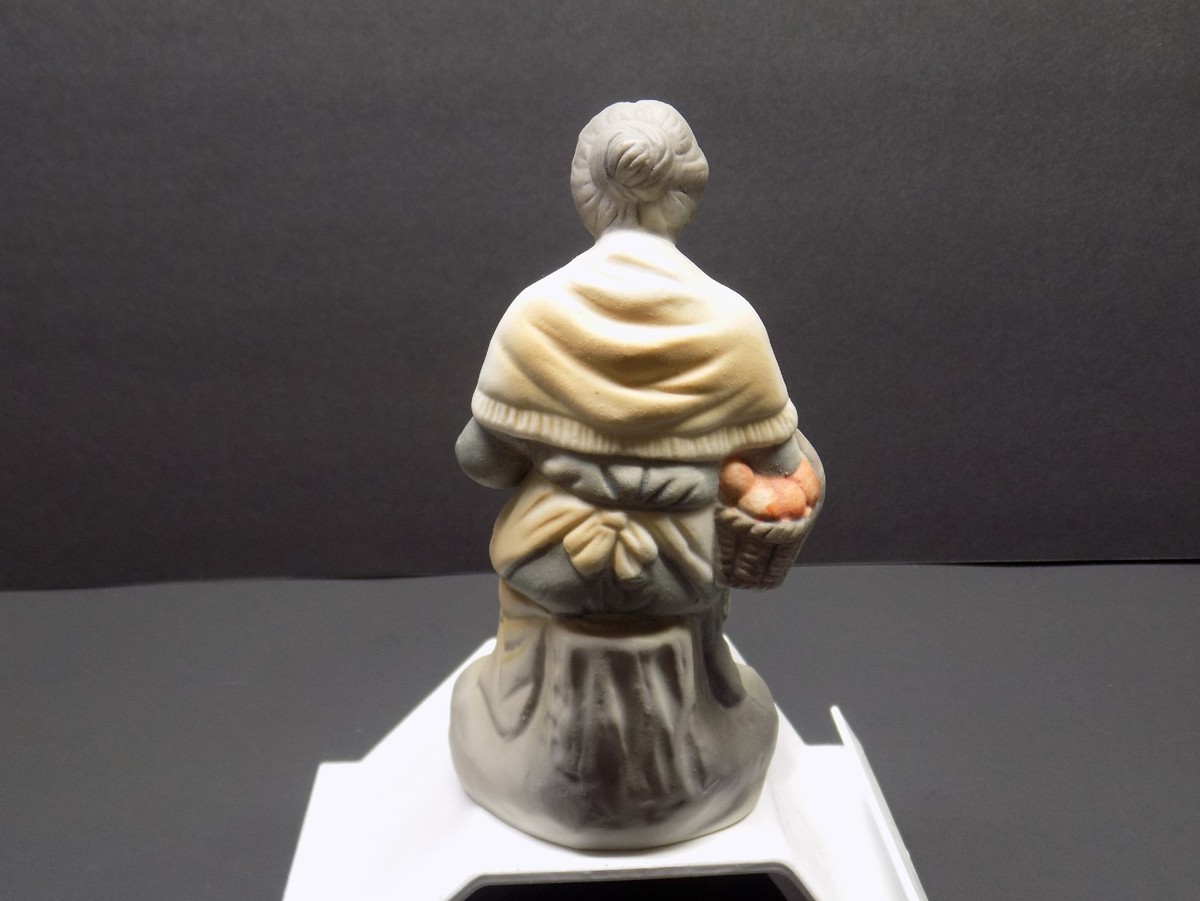 The figurine is finished in muted earth?tone colors and has a handcrafted look that fits beautifully with farmhouse decor, cottage?style displays, or collectible figurine shelves. The underside shows an unmarked base, common for many mid?century and late?20th?century decorative imports.
