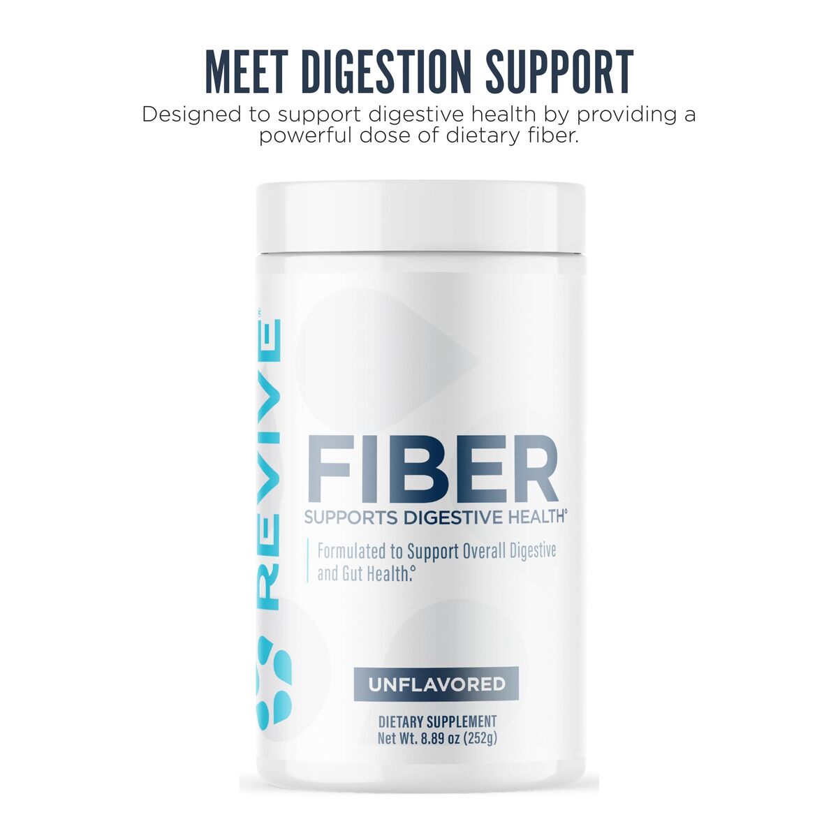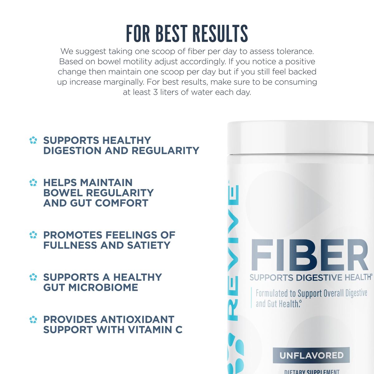Support Digestive Health: Fiber by Revive was designed to support digestive health by providing a powerful dose of dietary fiber. This formula contains a blend of soluble and insoluble fiber, which work together to promote healthy digestion, regularity, and overall gut health. Unflavored. 11 oz, 30 servings.,Key Ingredients: Each serving of this fiber supplement contains 5g of dietary fiber, which is essential for maintaining a healthy digestive system. This supplement is made with a blend of soluble and insoluble fiber, including Psyllium Husk, Inulin, and Flaxseed, which can help improve bowel regularity, promote satiety, and support healthy blood sugar levels.,Spark Healthy Habits: Take one scoop of Fiber per day to assess tolerance, and based on bowel motility, adjust accordingly. For the best results, consume at least 3 liters of water each day.,Everything You Need ? Nothing You Don?t: Our formulas only consist of effective ingredients, no artificial filler or dye. Revive?s Fiber supplement is doctor-formulated and made with natural ingredients, making it a great choice for anyone looking for a natural way to support their overall health and well-being.,Experience the Difference: The mission here at Revive MD begins with you. Our vision is to encourage, educate, and empower you to harness the powers of nature to better your health. Through the art of supplementation, we strive to help you experience the highest quality of life.