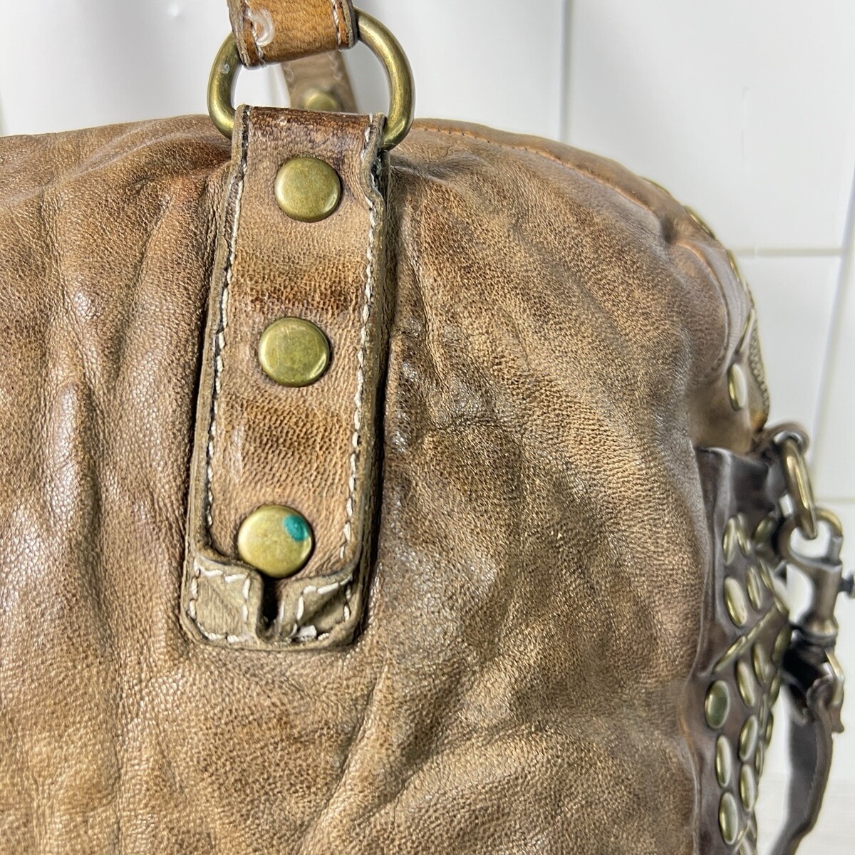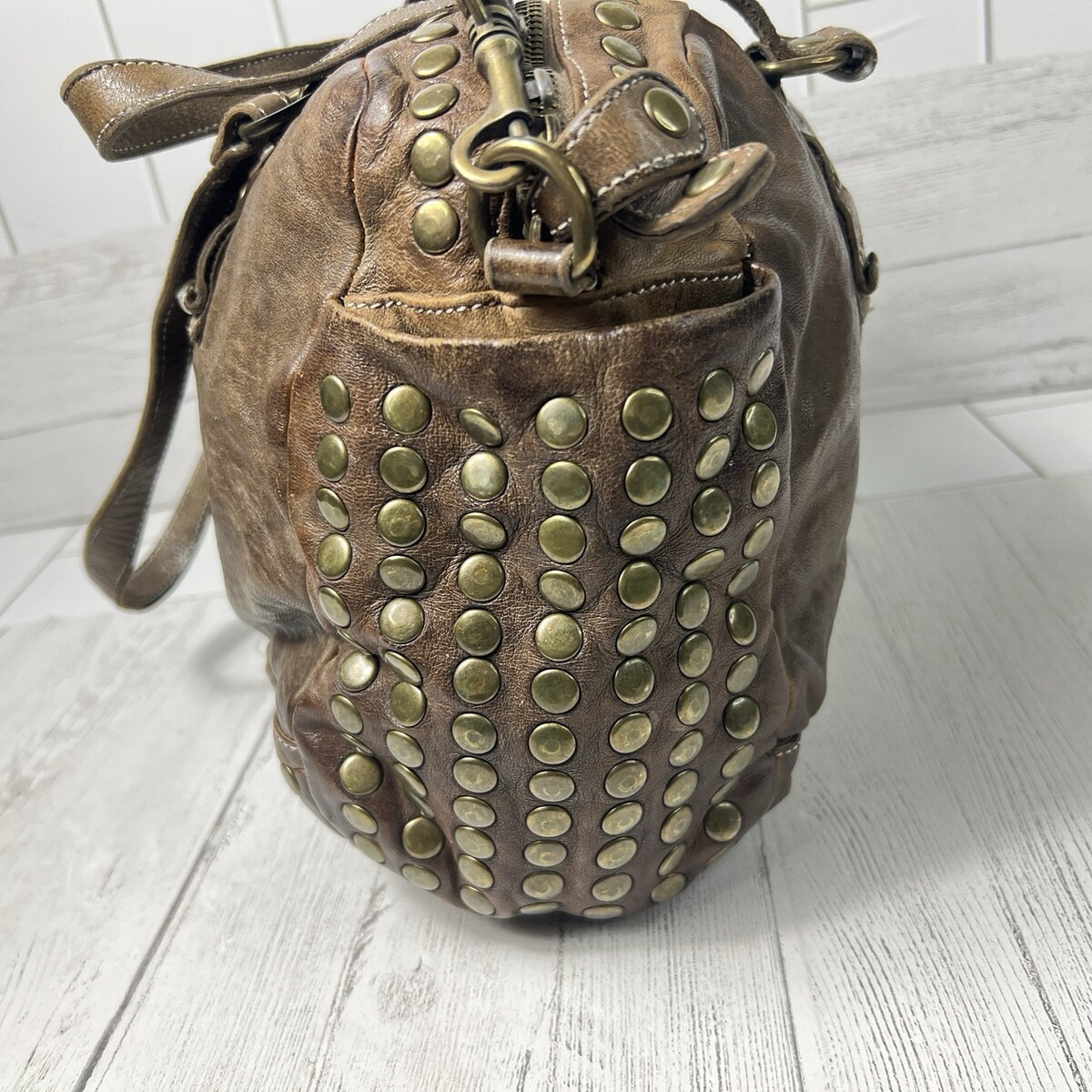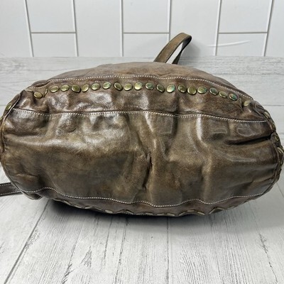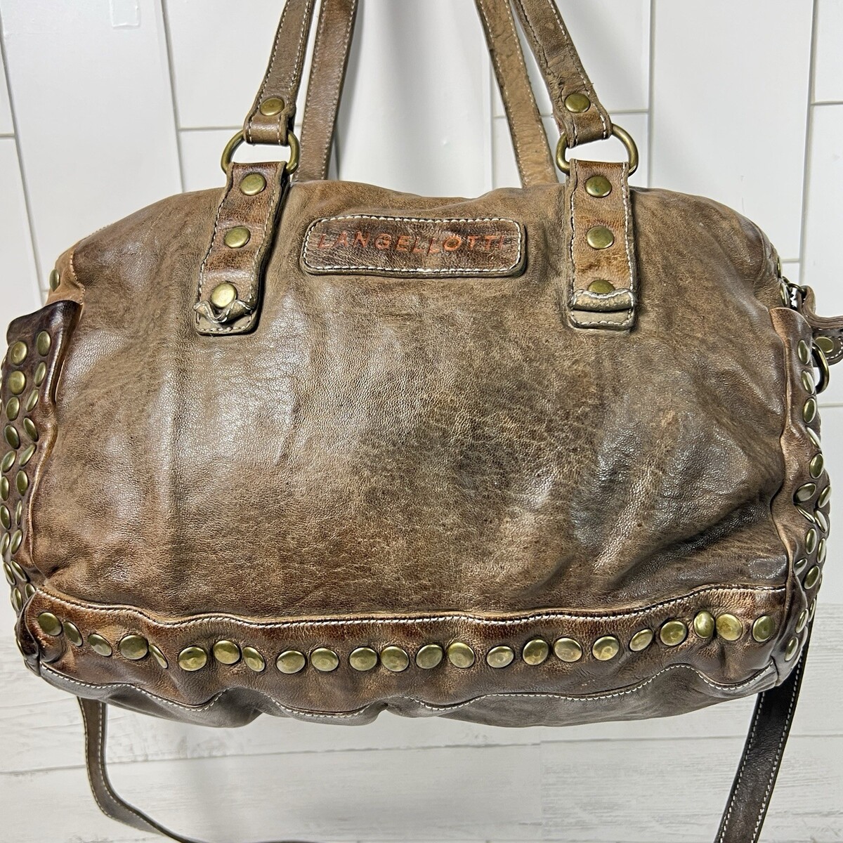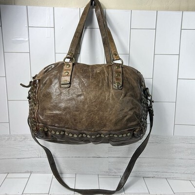 Langelotti Brown Distressed Leather Studded Boho Satchel Shoulder Crossbody Bag