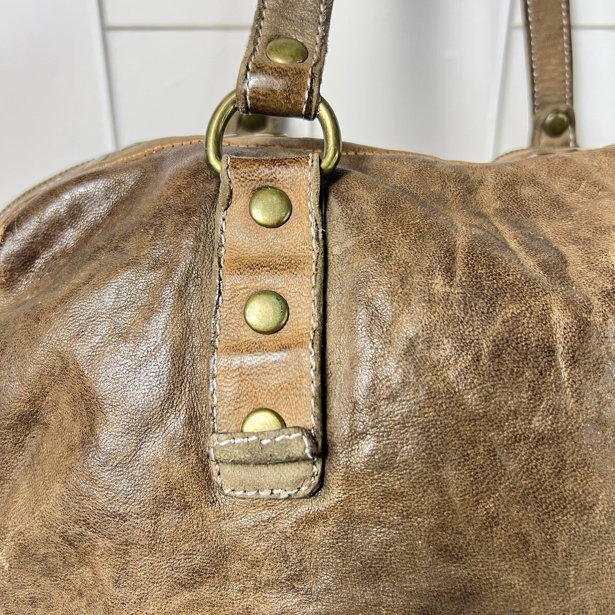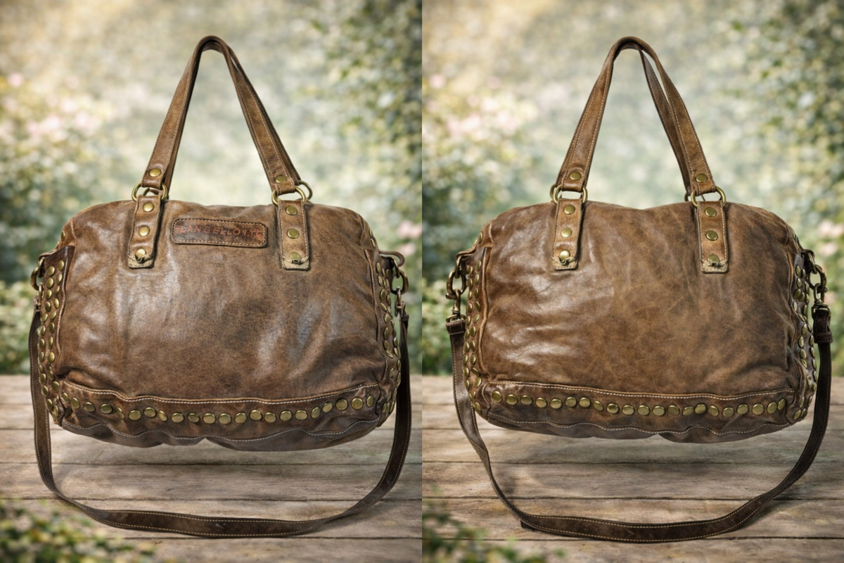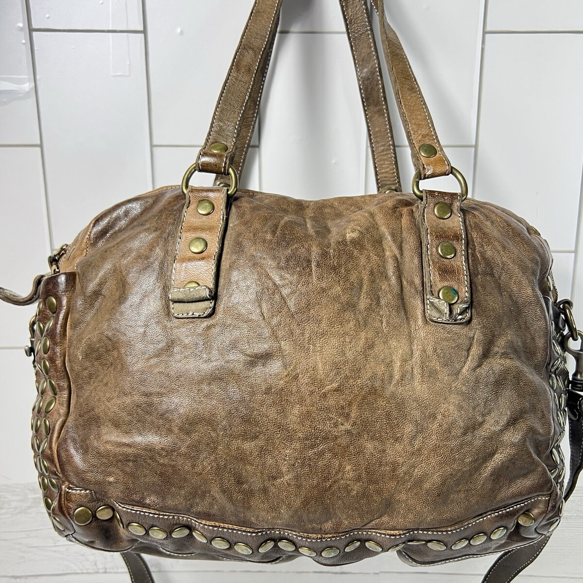 Langelotti Brown Distressed Leather Studded Boho Satchel Shoulder Crossbody Bag