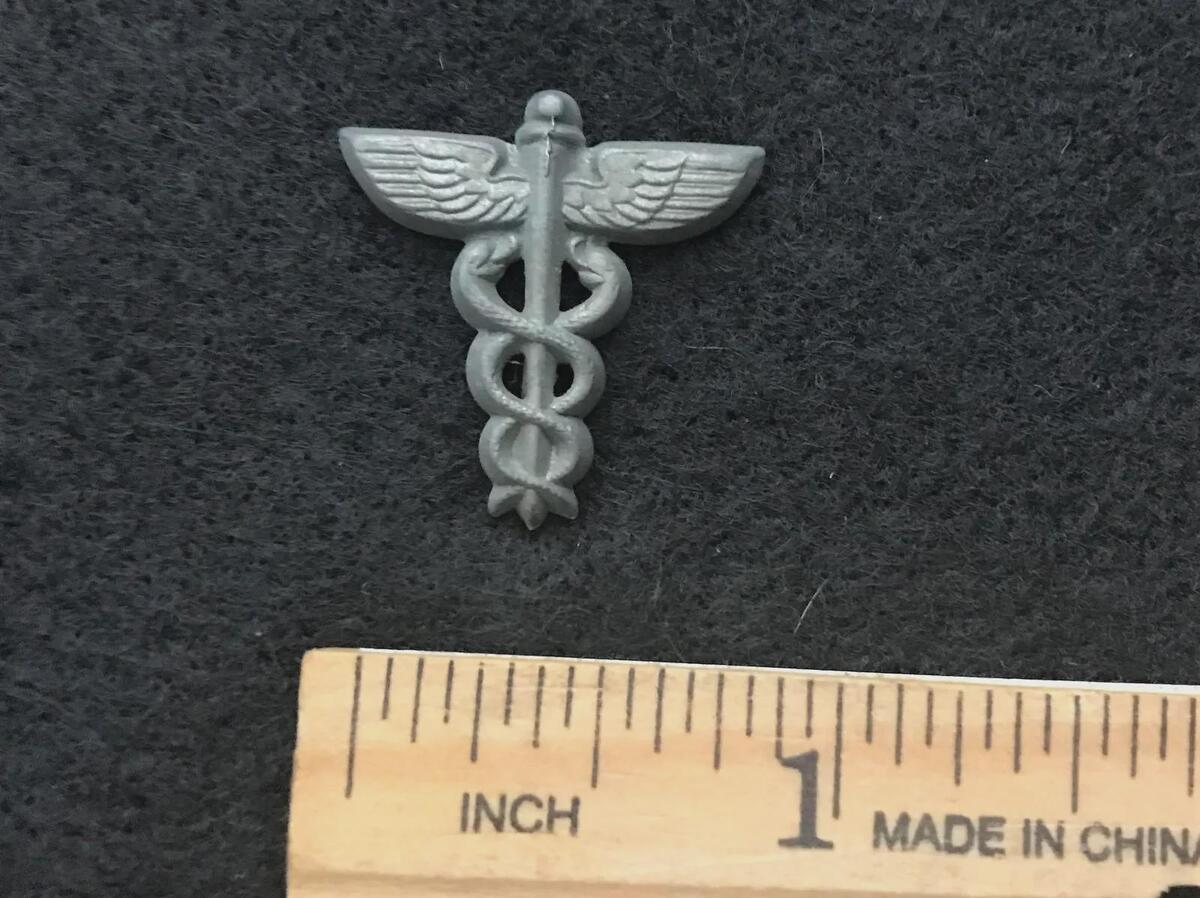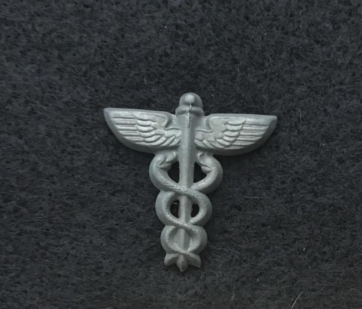 This listing features an authentic World War II European Army Medical Corps enlisted collar pin, displaying the classic caduceus symbol. This genuine silver-tone artifact, worn by enlisted medics on their lapels, is not a reproduction and is in great, well-preserved condition for its age. Please review all provided high-resolution images for visual confirmation of this unique historical piece.