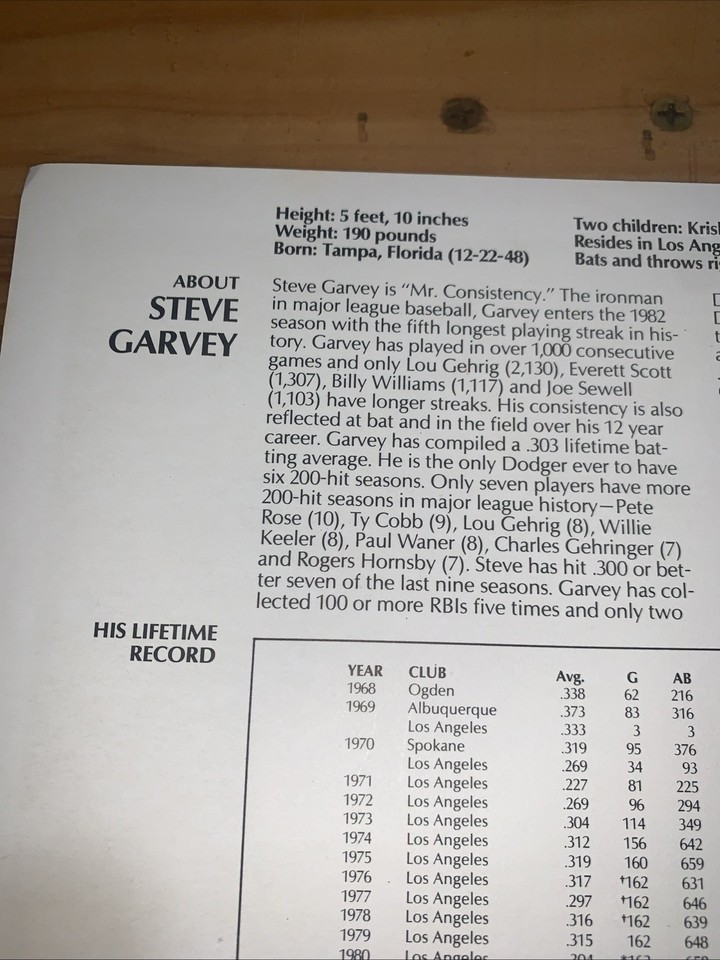 The product is a vintage 1982 color print featuring baseball player Steve Garvey from the Los Angeles Dodgers. Measuring 8 1/2" x 11", this original print is a unique piece of sports memorabilia that captures a moment in baseball history. Created by artist Volpe and sponsored by Union Oil, this piece is a collectible item for fans of the Los Angeles Dodgers and baseball enthusiasts alike. Made in the United States, this vintage print offers a glimpse into the past with a touch of nostalgia and artistic flair.