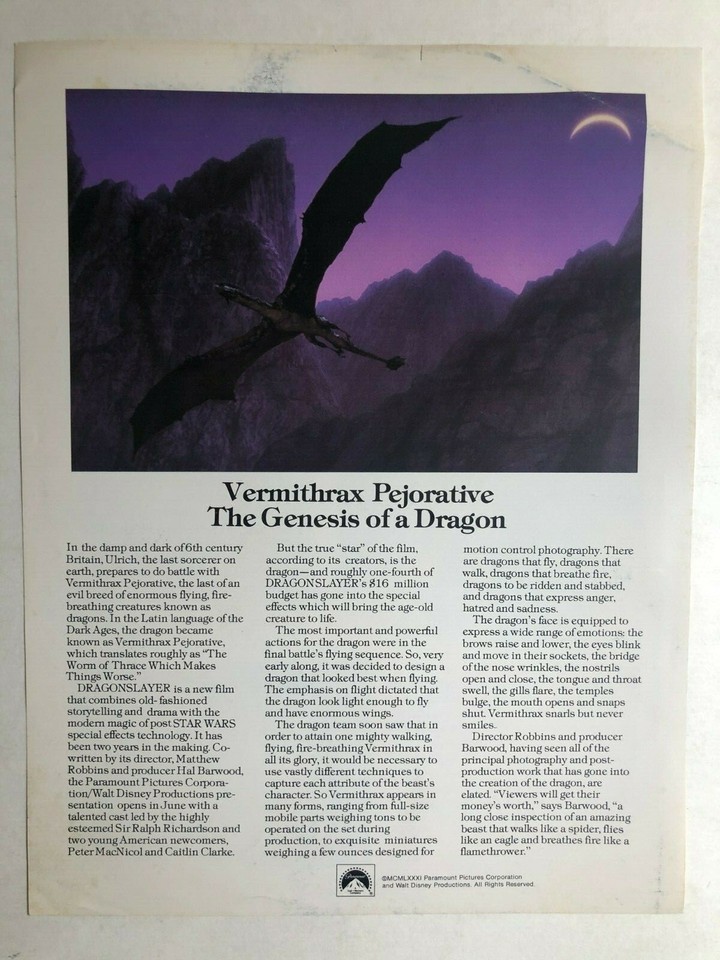 DRAGONSLAYER (1981) color promotional flyer for the film