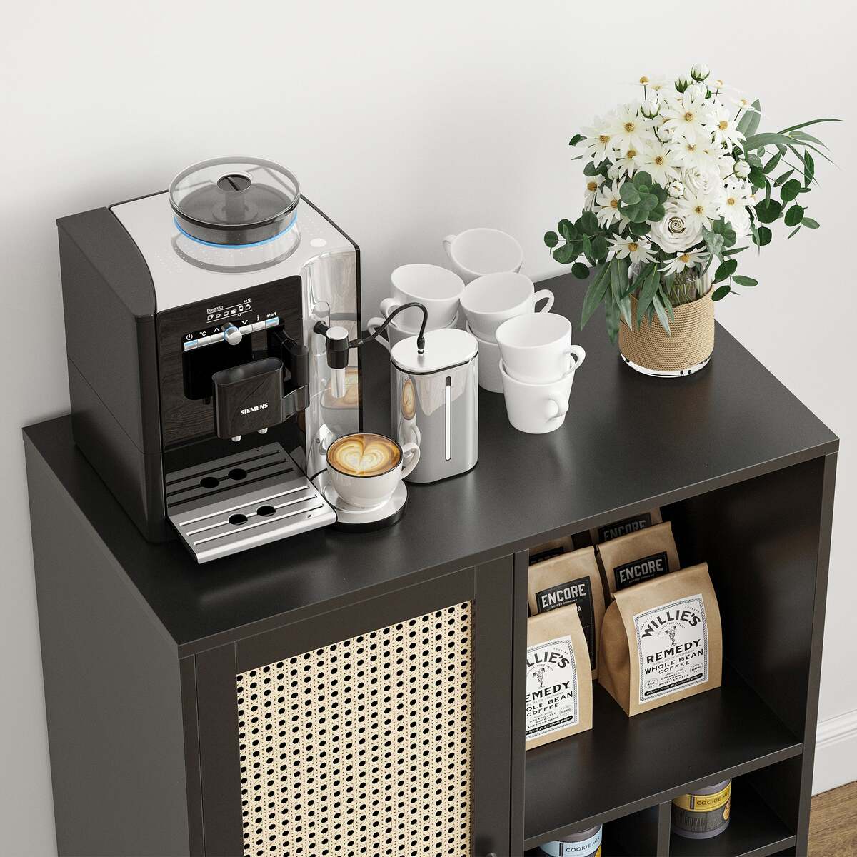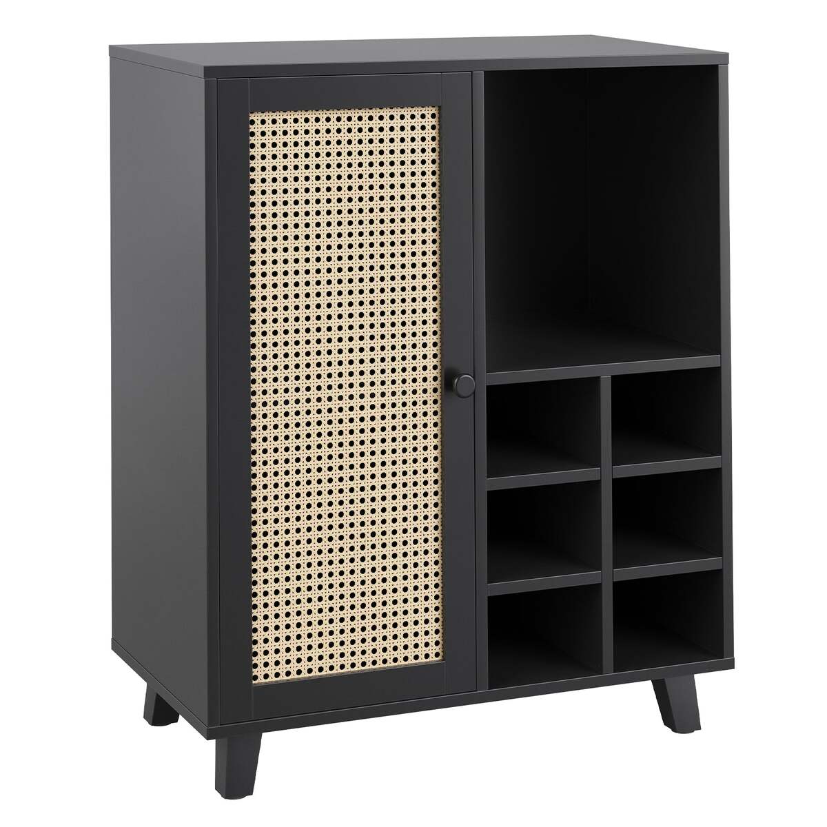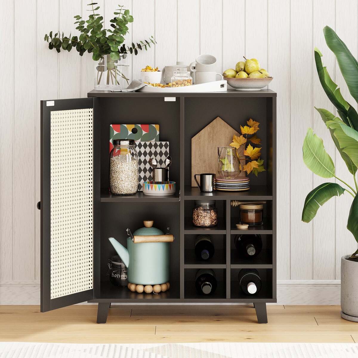 Rattan-Front Door: The cabinet features a rattan-paneled door that creates a light, airy aesthetic, offering a natural look while concealing your items for a tidy environment.