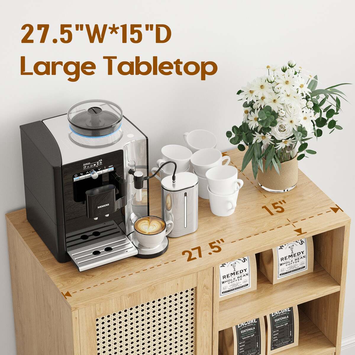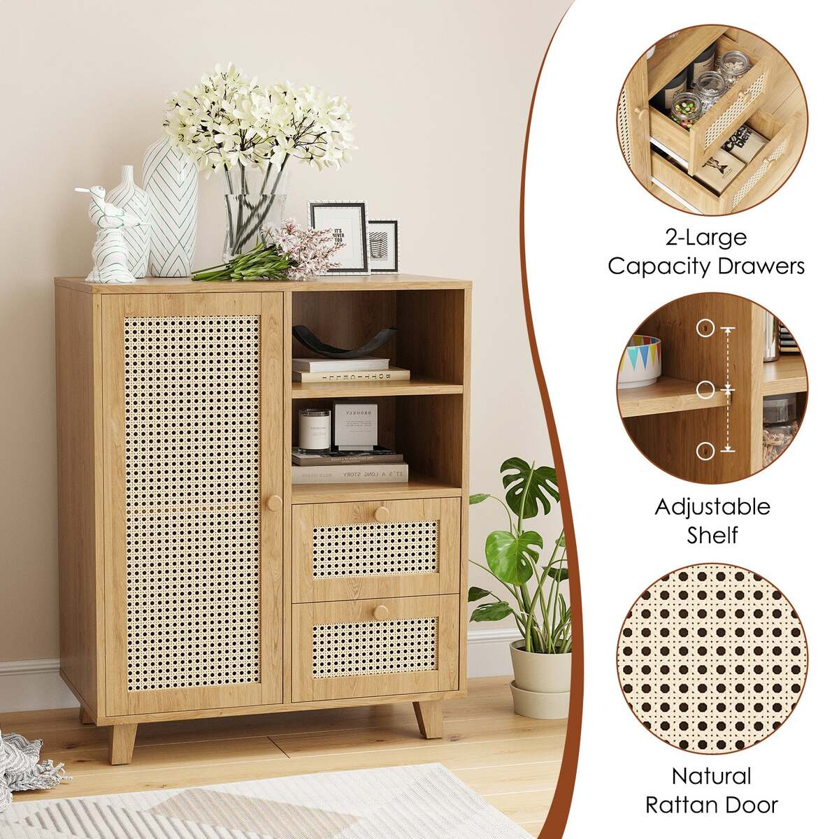 ?Rattan-Front Door?: The cabinet features a rattan-paneled door that creates a light, airy aesthetic, offering a natural look while concealing your items for a tidy environment.