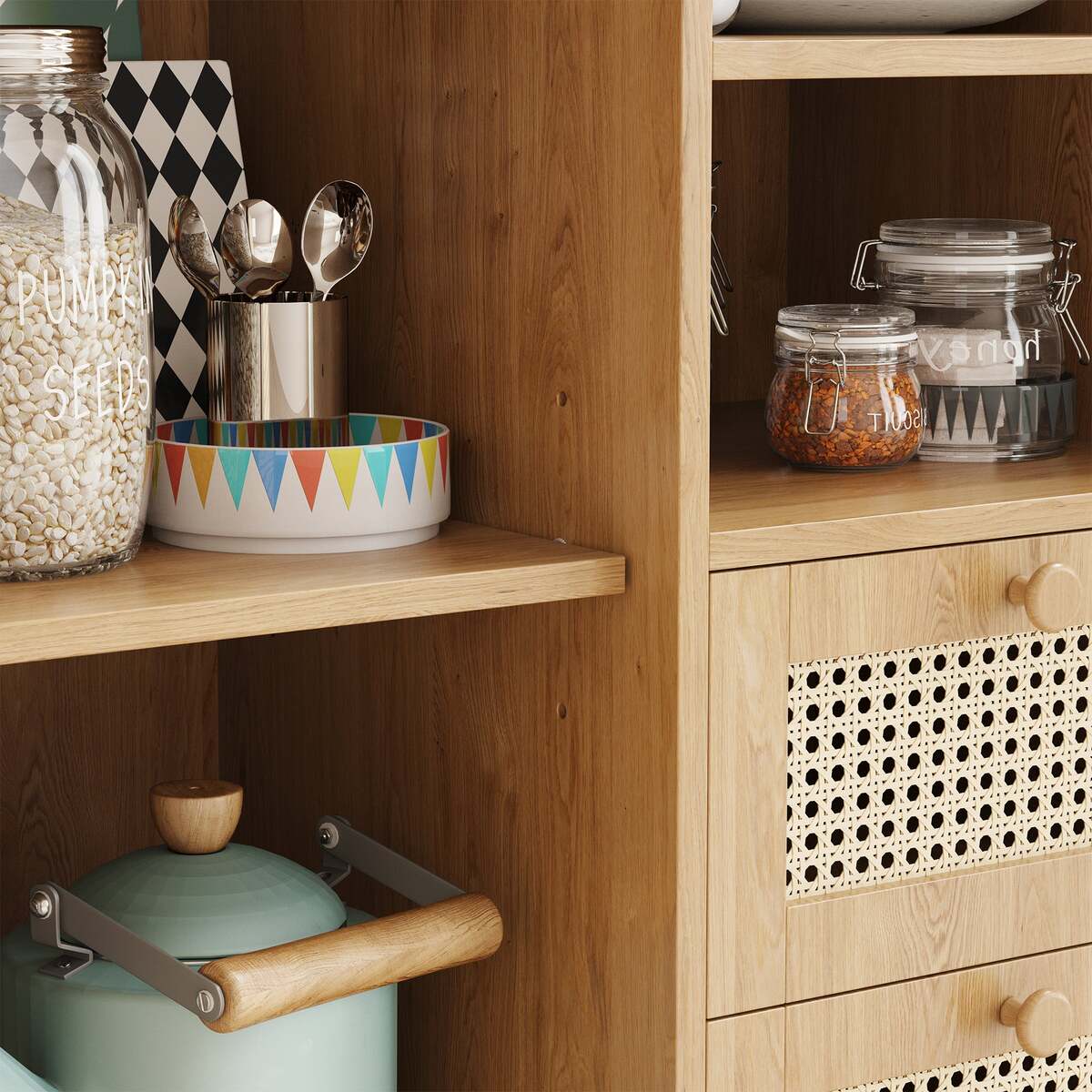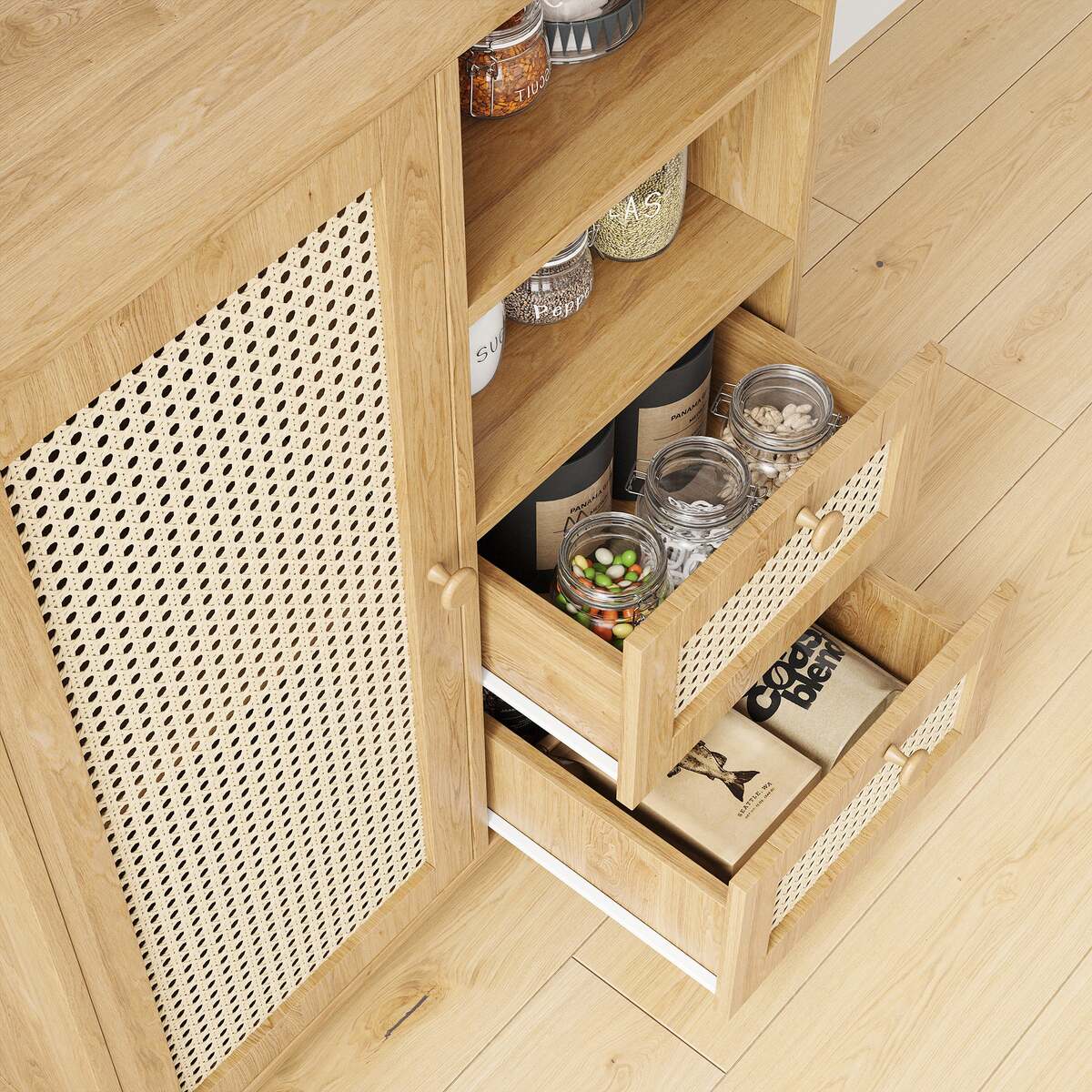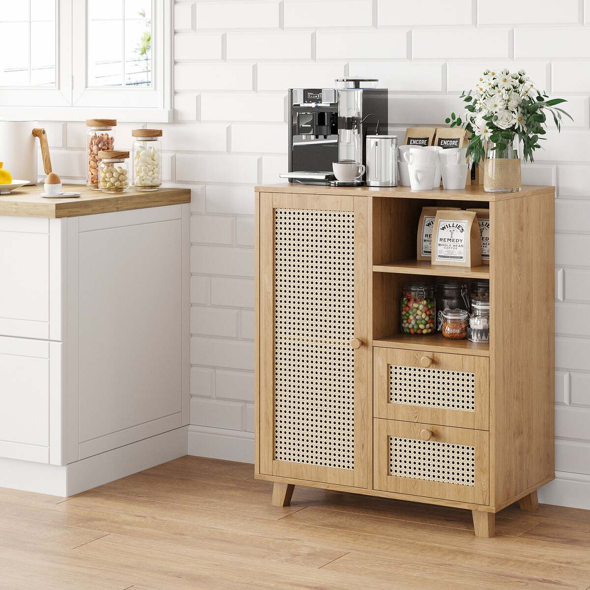 Rattan Buffet Cabinet Sideboard: Drawers, Adjustable Shelf Storage