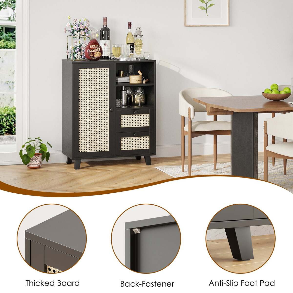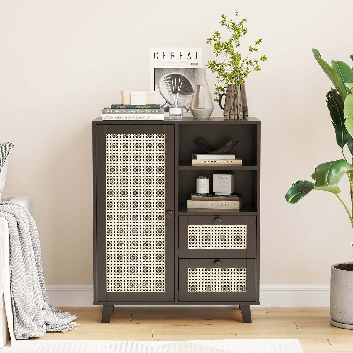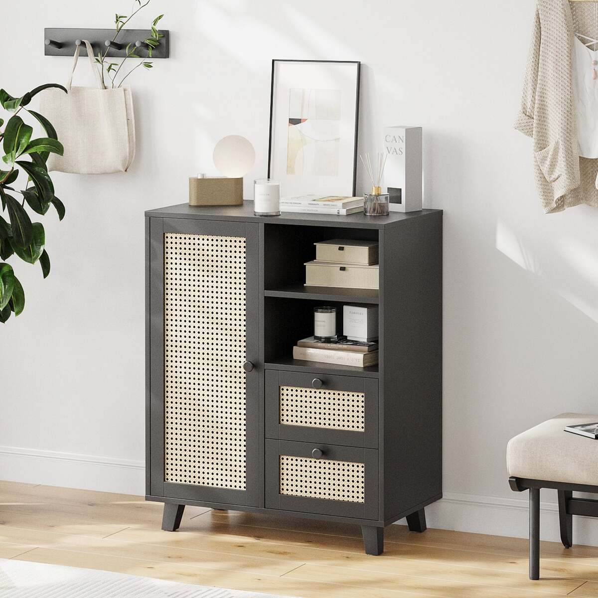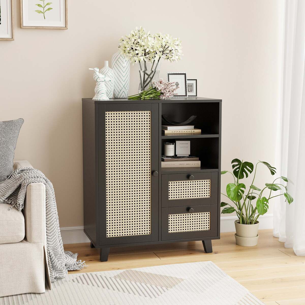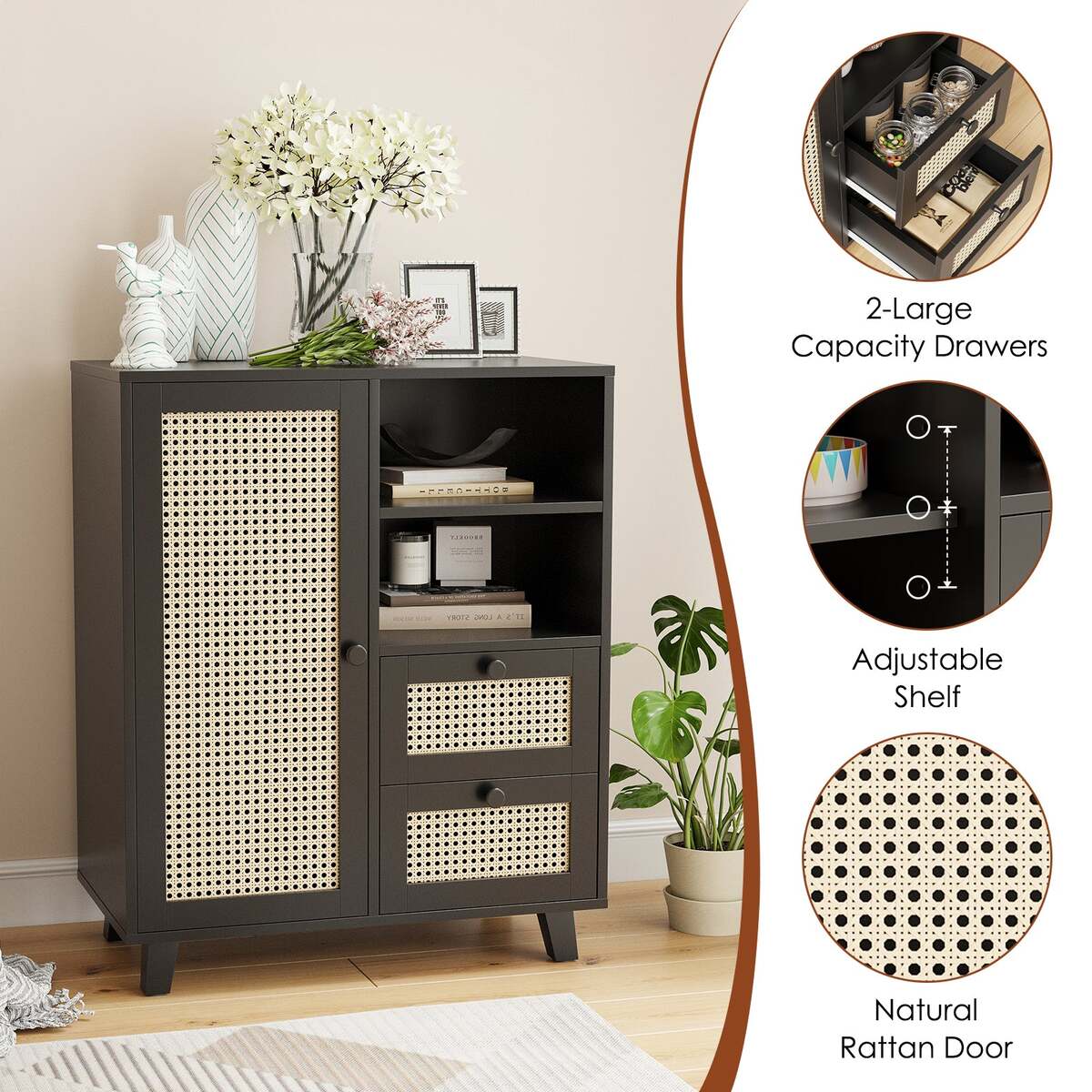 ?Rattan-Front Door?: The cabinet features a rattan-paneled door that creates a light, airy aesthetic, offering a natural look while concealing your items for a tidy environment.