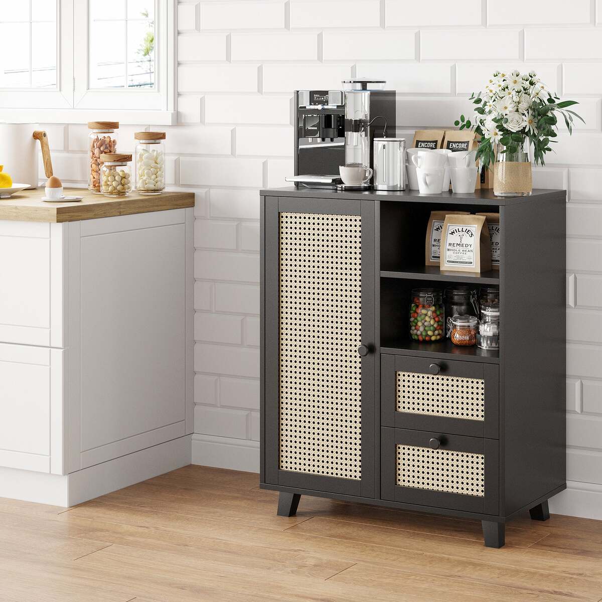 Rattan Buffet Cabinet Sideboard w/ Drawers, Adjustable Shelf