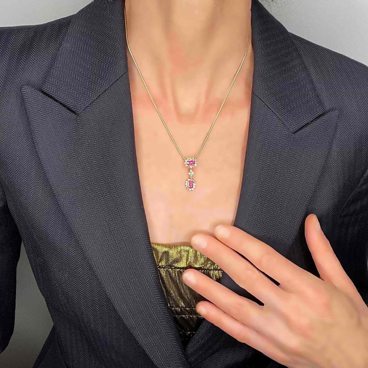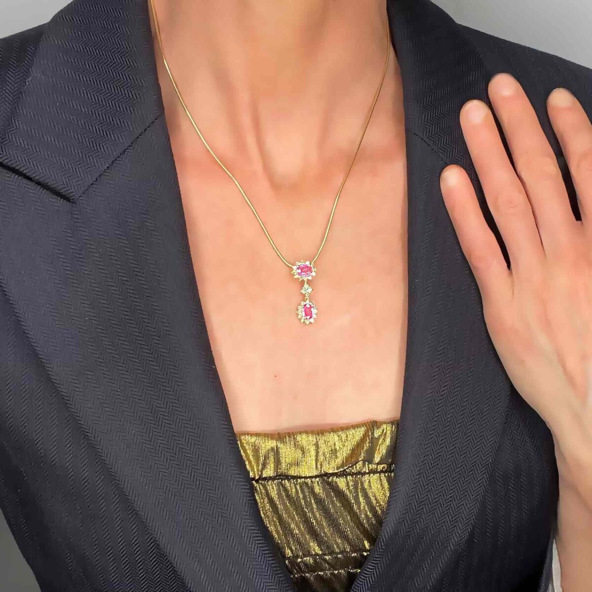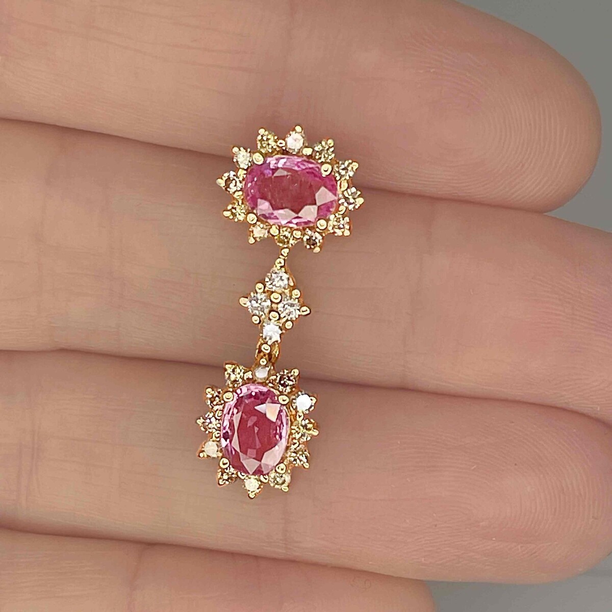 pretty natural unheated untreated pink sapphire and unheated untreated diamond solid 14K gold double drop pendant, 2.25 cttw.